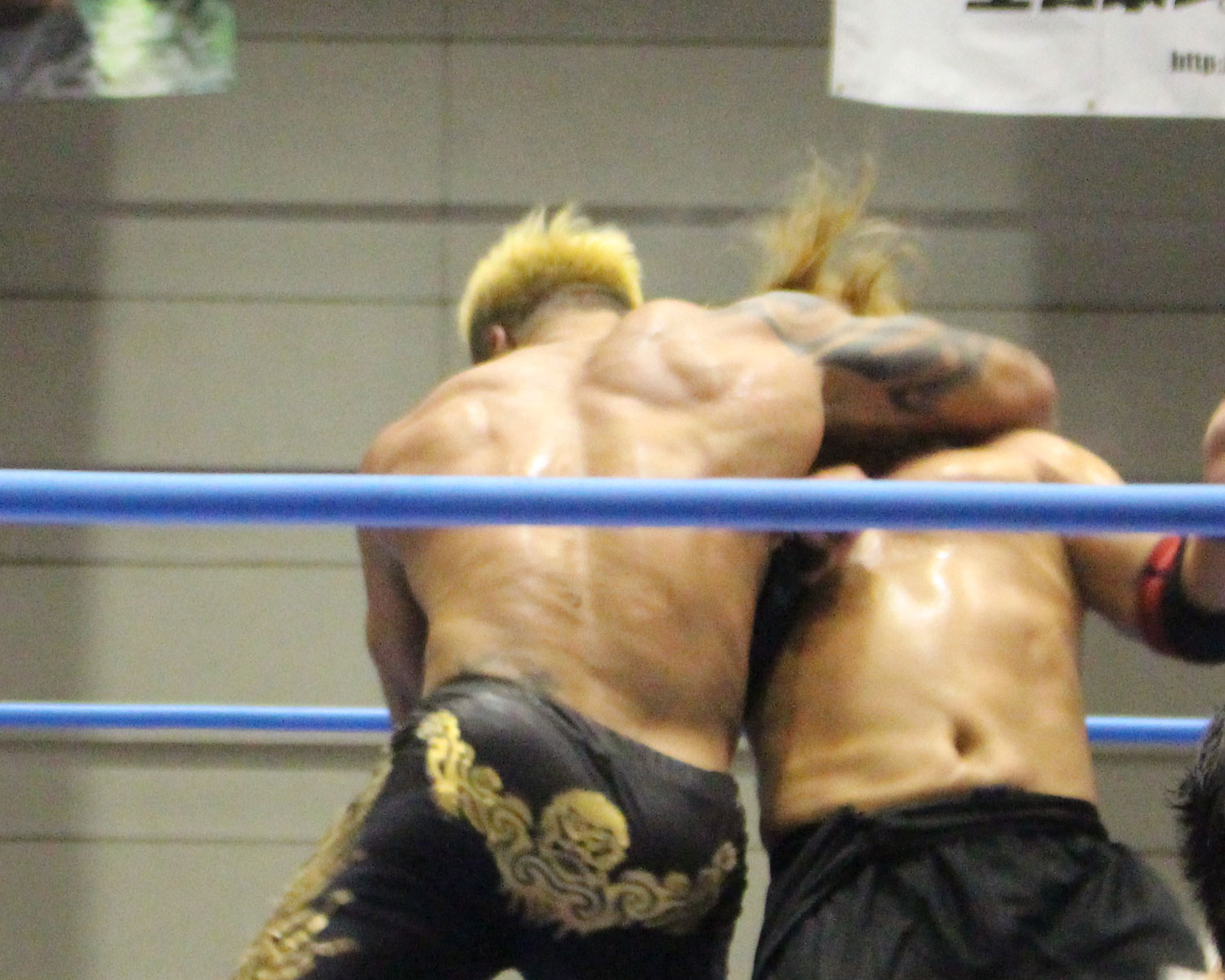 内容的には土井が吉野の想定外を突くような意外性で吉野を追い詰め、掟破りのソルナシエンテにはさすがの吉野も慌てたが、吉野は進化系のソルナシエンテで土井からギブアップを奪い振り切ったものの、自分的にはこれまで清水らにナメられてきた経緯を見てきたことから、今回は土井に勝って欲しかったというのが本音だった。セミのツインゲート選手権は、序盤こそはナルシストポーズで余裕の構えを見せるYAMATOに対し、シュンが舐めるなといわんばかりにバイシクルキックでYAMATOを場外へ追いやってから三角飛びプランチャを発射、望月のリードで王者組を攻め立てる。