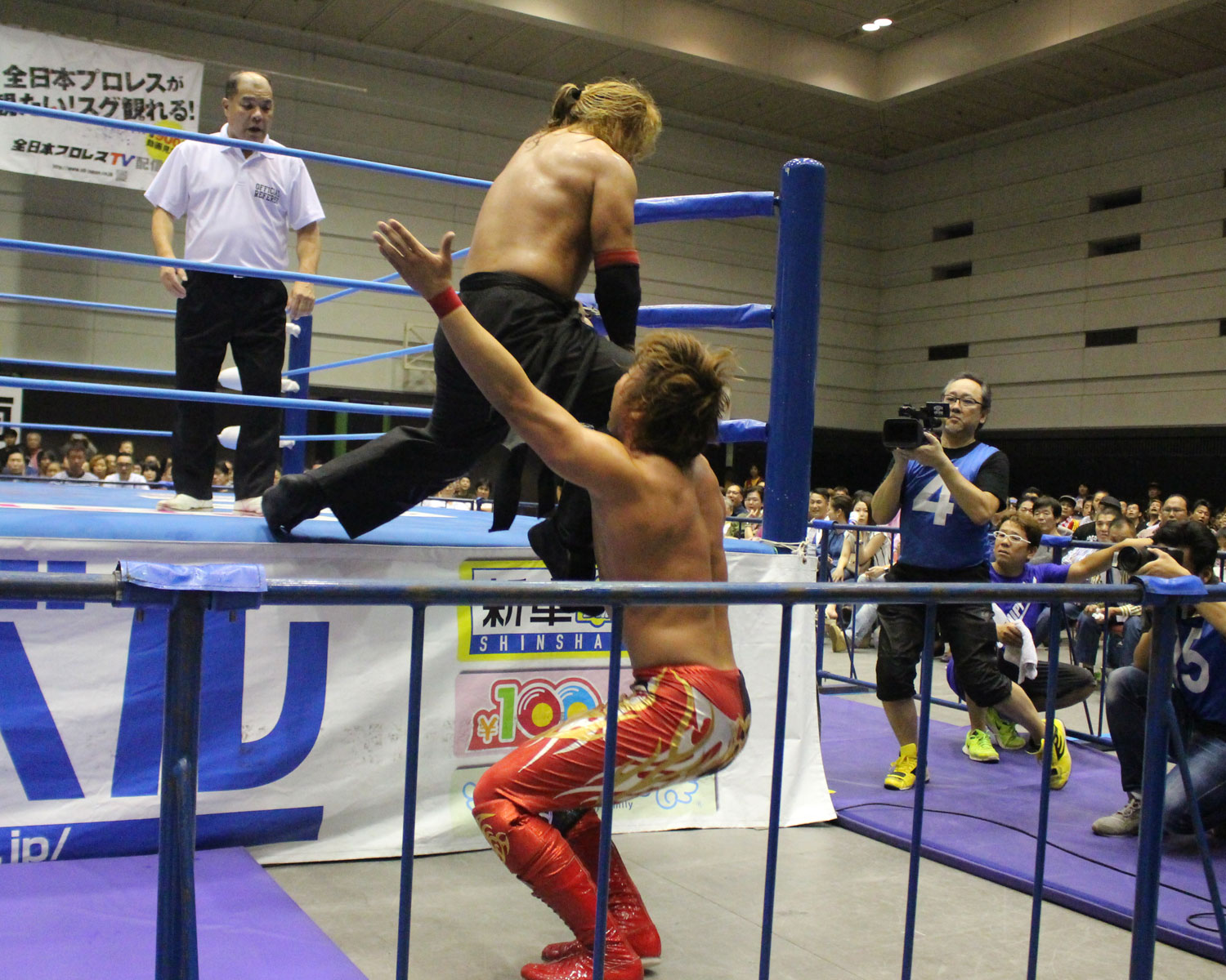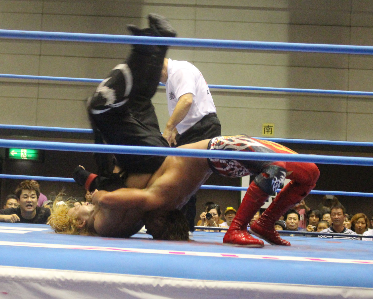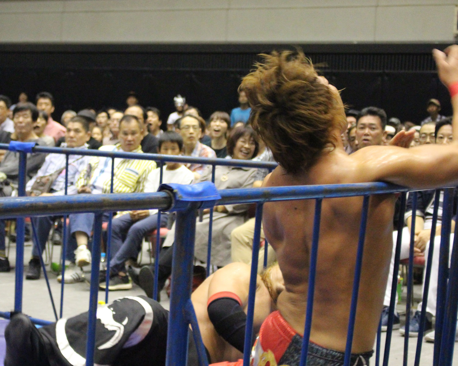 吉野はコウモリで反撃を狙うが、そのまま担いだ土井がバックドロップで投げるが、突進したところで吉野が場外へ追いやると最高速トペスイシーダを発射、しかしリングに戻ってからのミサイルキックはかわした土井が華厳、吉野のスリングブレイドをかわして変形のグラウンド卍で捕獲するなど、ジャベの使い手である吉野相手に土井がジャベで苦しめる。