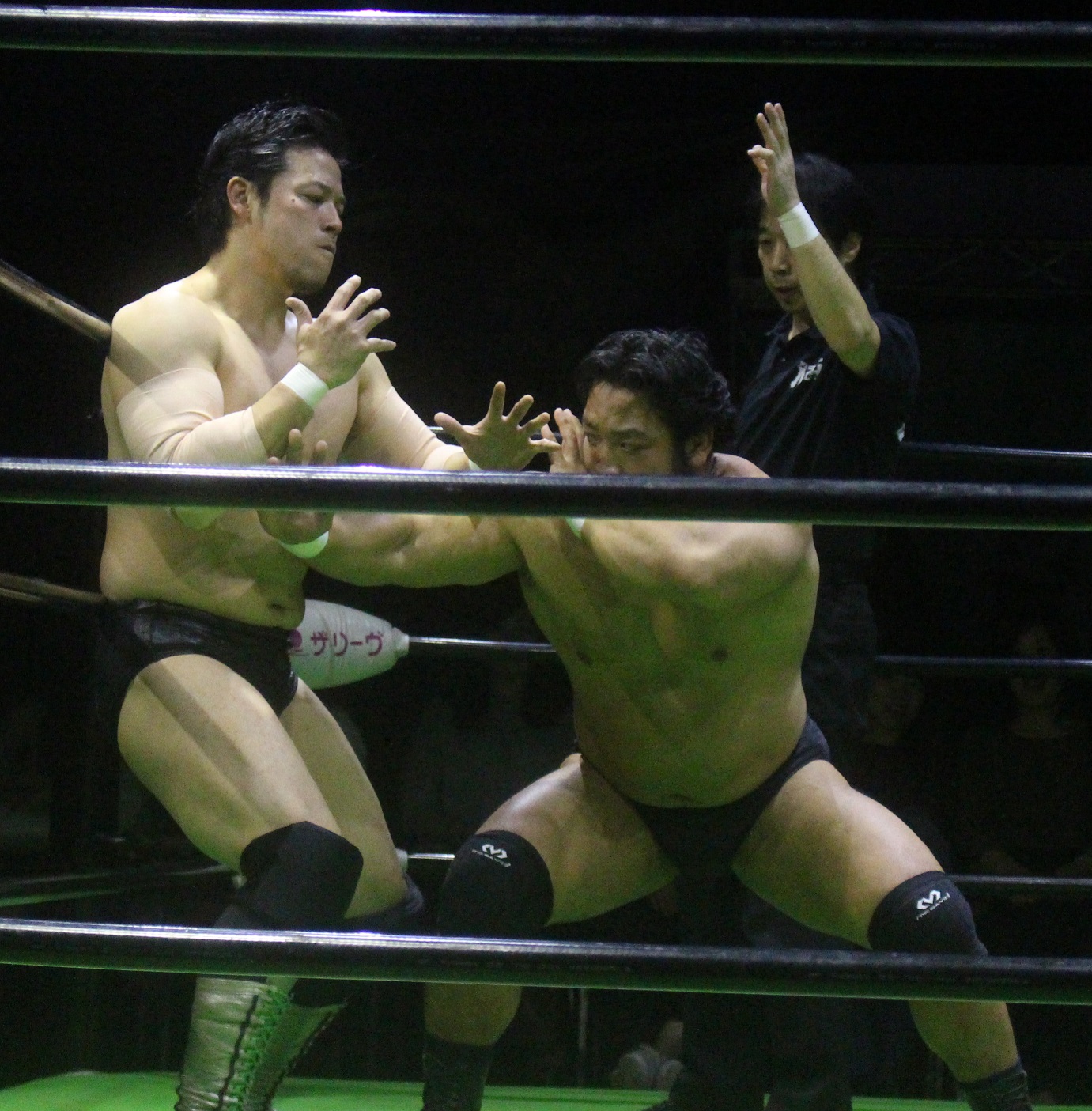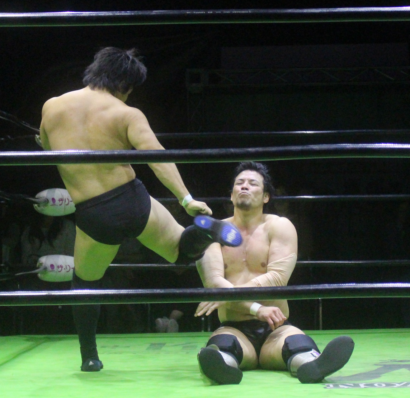 潮崎はスタンディグ式肩固めで捕獲、しかしコーナーからの攻撃は拳王がジャンピングキックで阻止してから雪崩式狙いは、潮崎が宙吊り式肩固めで捕獲、自ら技を解いた後でダウンしている拳王の後頭部にダイビングニードロップを投下する。