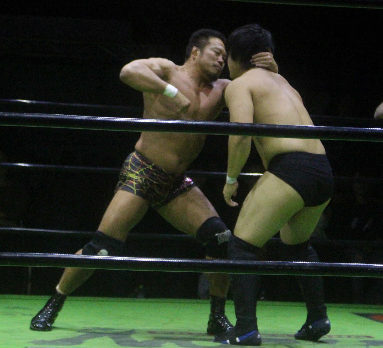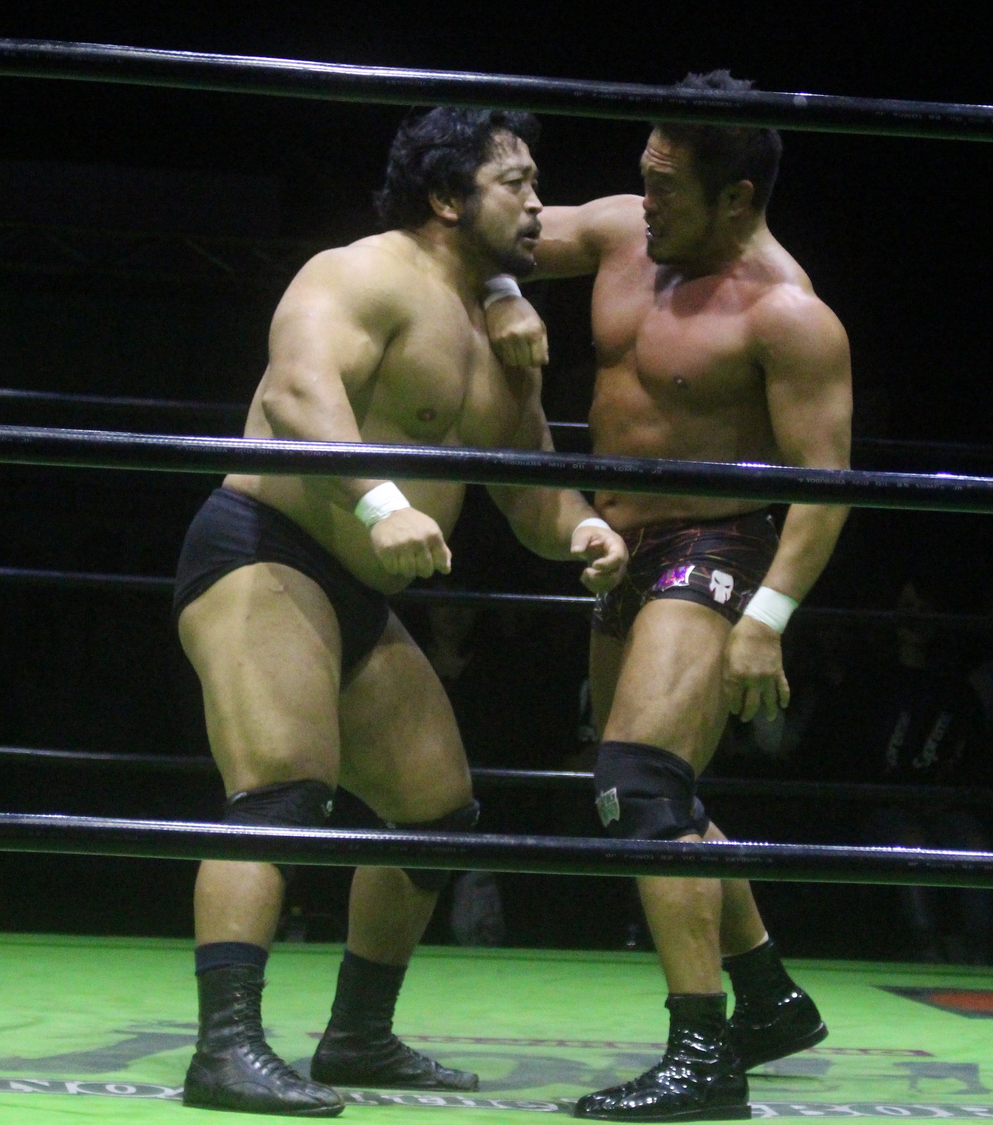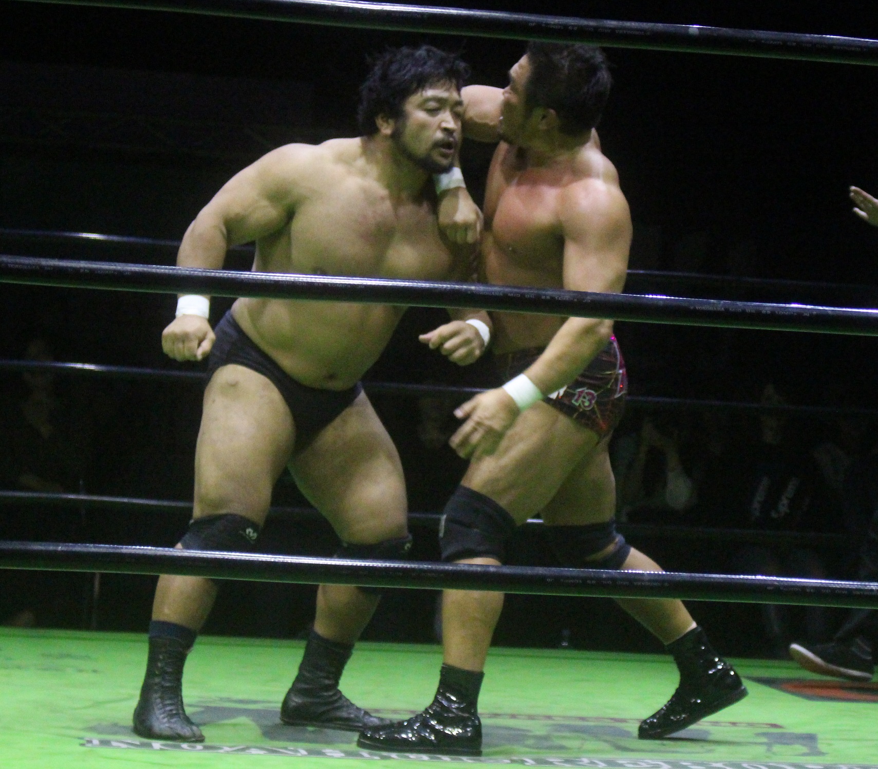 拳王のフロントハイキックも受けきった潮崎はマシンガンチョップを乱打、だが拳王もポジションを入れ換えてマシンガンミドルキックで応戦、だが潮崎もポジションを変えてマシンガンチョップで返し、手刀からフィッシャーマンズバスターを決める。