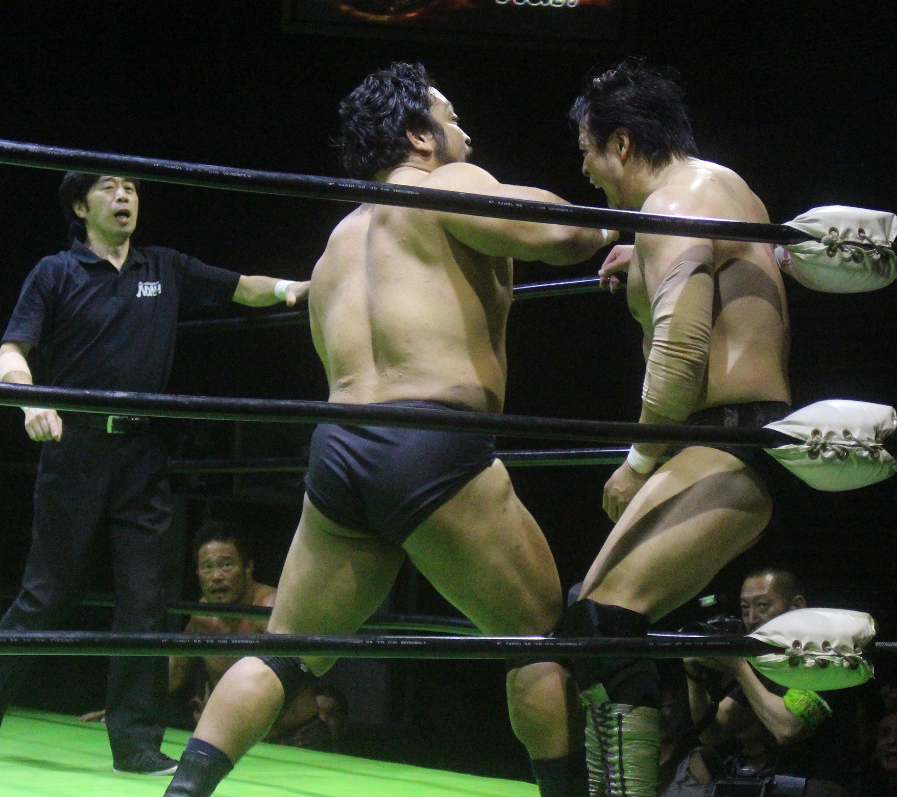 拳王「Aブロックから上げってきただけあるよ。そして、ノアの昔からいる選手だけあるよ。やっぱりよ、当たりも強い。力も凄く強いよ。でもな、その強い潮崎を俺が倒したんだろ? 俺のほうがもっと強いよ! 俺がこれからこのノアの舵取りをしていくからな」