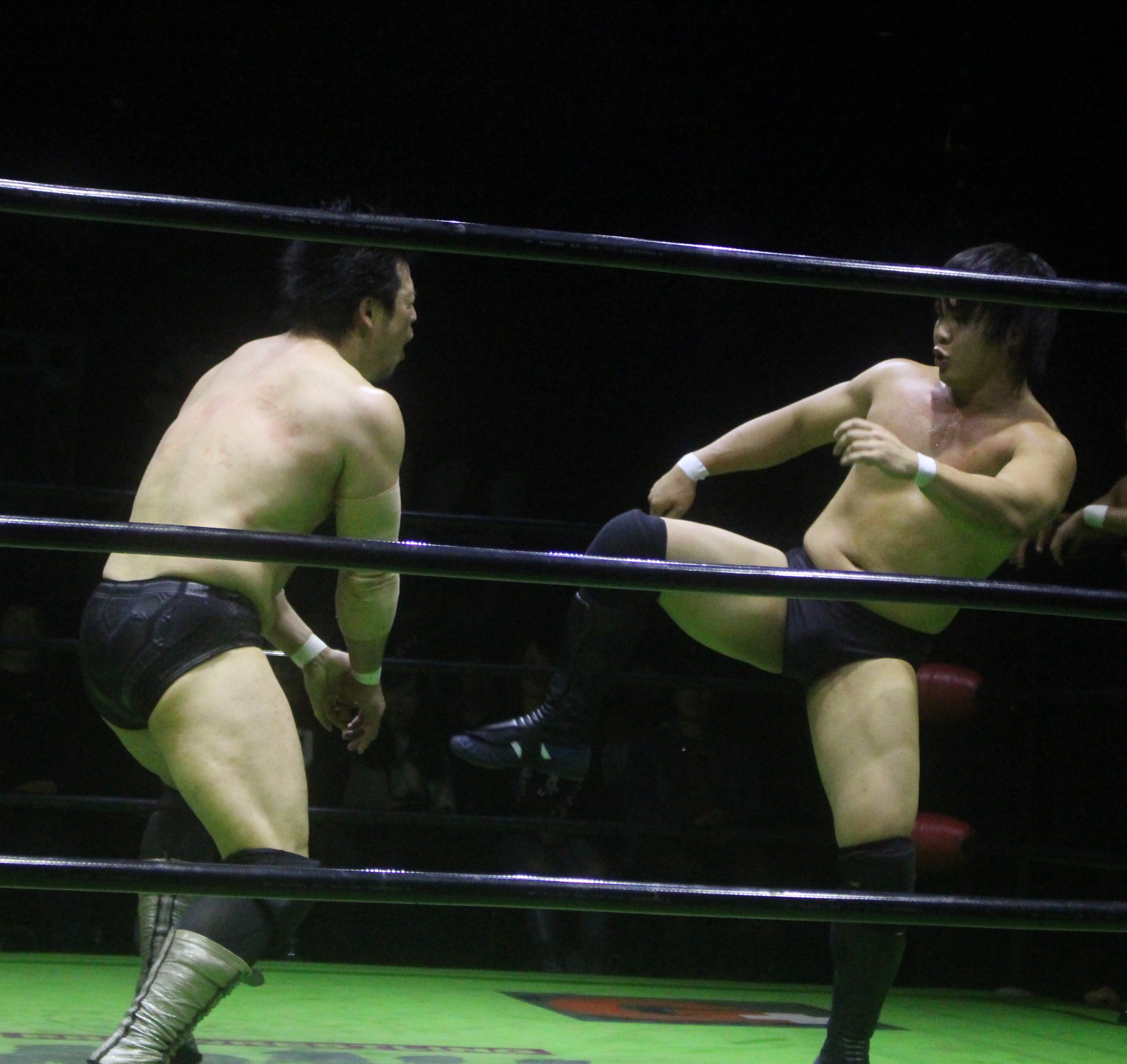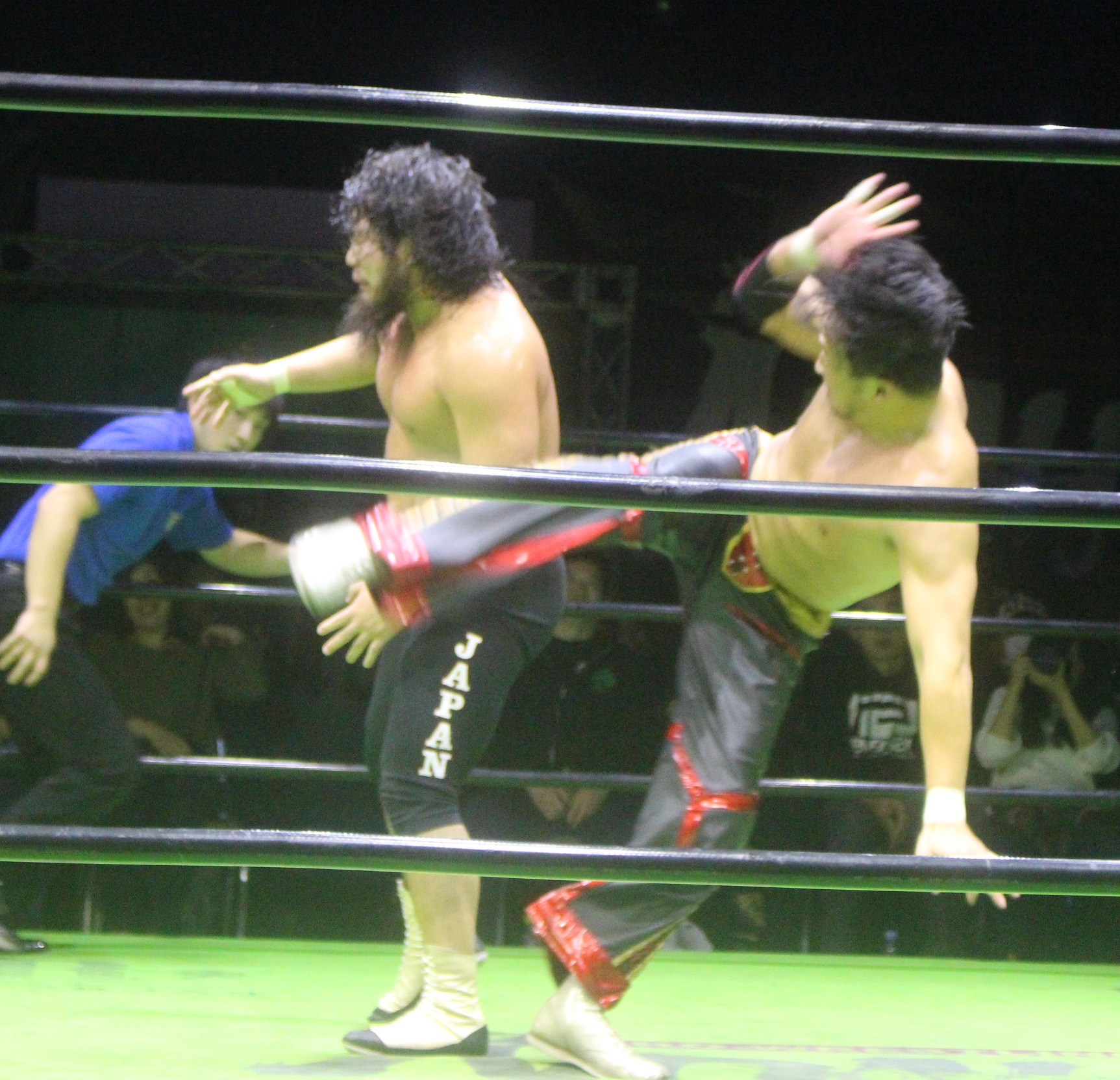 潮崎は劣勢の拳王に手刀を乱打するが、ブレーンバスター狙いは拳王が踏ん張ると、ボディーにミドルキックの連打を浴びせ、ロープに飛んだ潮崎にミドルキック、ローキックで足を刈ってから背中へのフットスタンプ、延髄ダブルニーと反撃し、セカンドロープからのダブルニーを潮崎のボディーの投下、だが拳王の串刺しフロントハイキックの後で、追尾した潮崎は串刺し逆水平を浴びせると、フライングショルダーを放って拳王にリードを許さない。