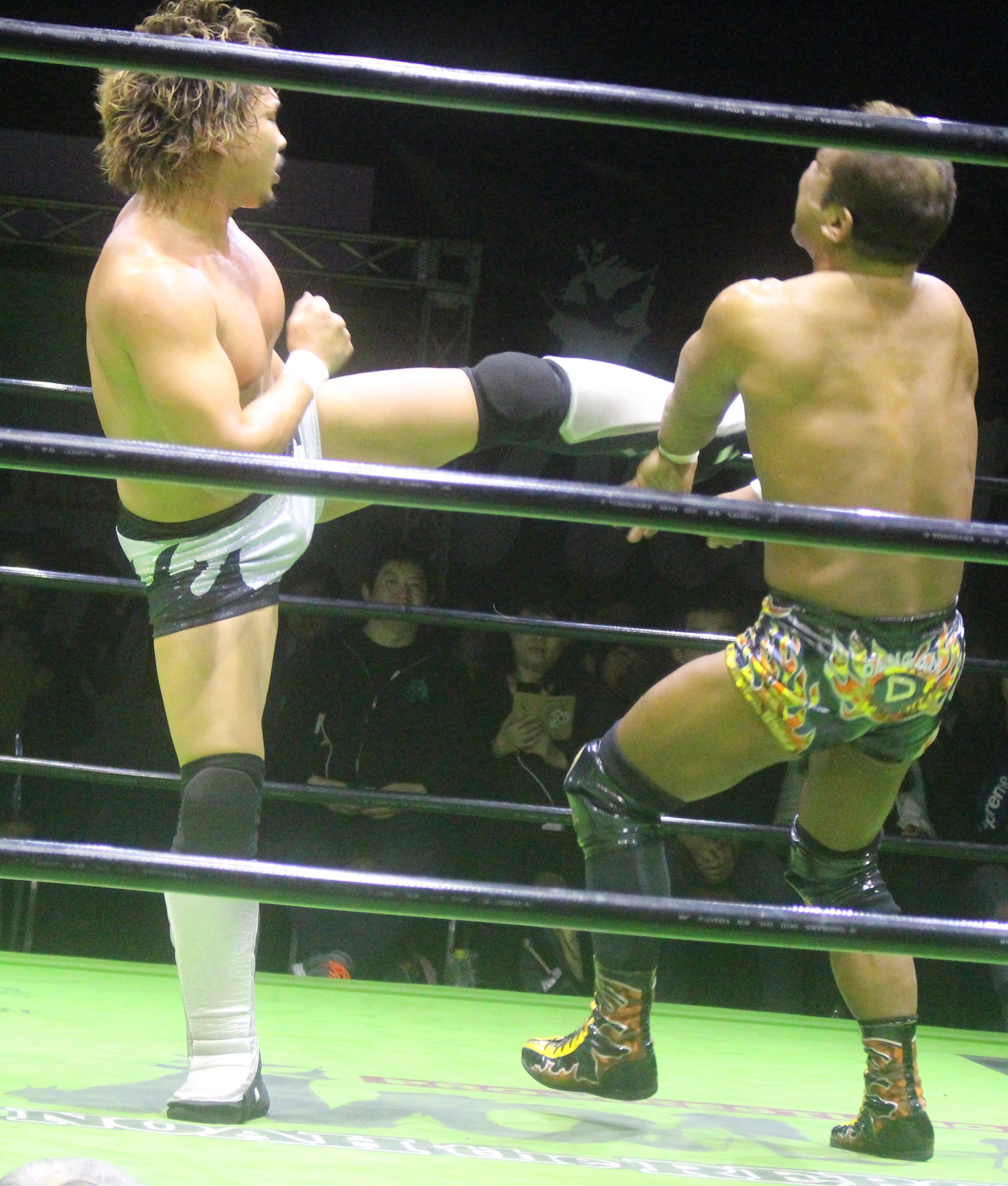 起き上がった拳王は張り手、ミドルキック、潮崎も逆水平と応酬し合うと、潮崎はロープへ走るが、拳王がミドルキックで迎撃し、側頭部を蹴り上げてトラースキックを狙うが、キャッチした潮崎はパワーボムで叩きつけ、ムーンサルトプレスを狙う。しかし背後から足を刈った拳王は雪崩式ドラゴンスープレックスで投げると、すかさずダイビングフットスタンプを投下するが、潮崎はカウント2でキックアウトする。