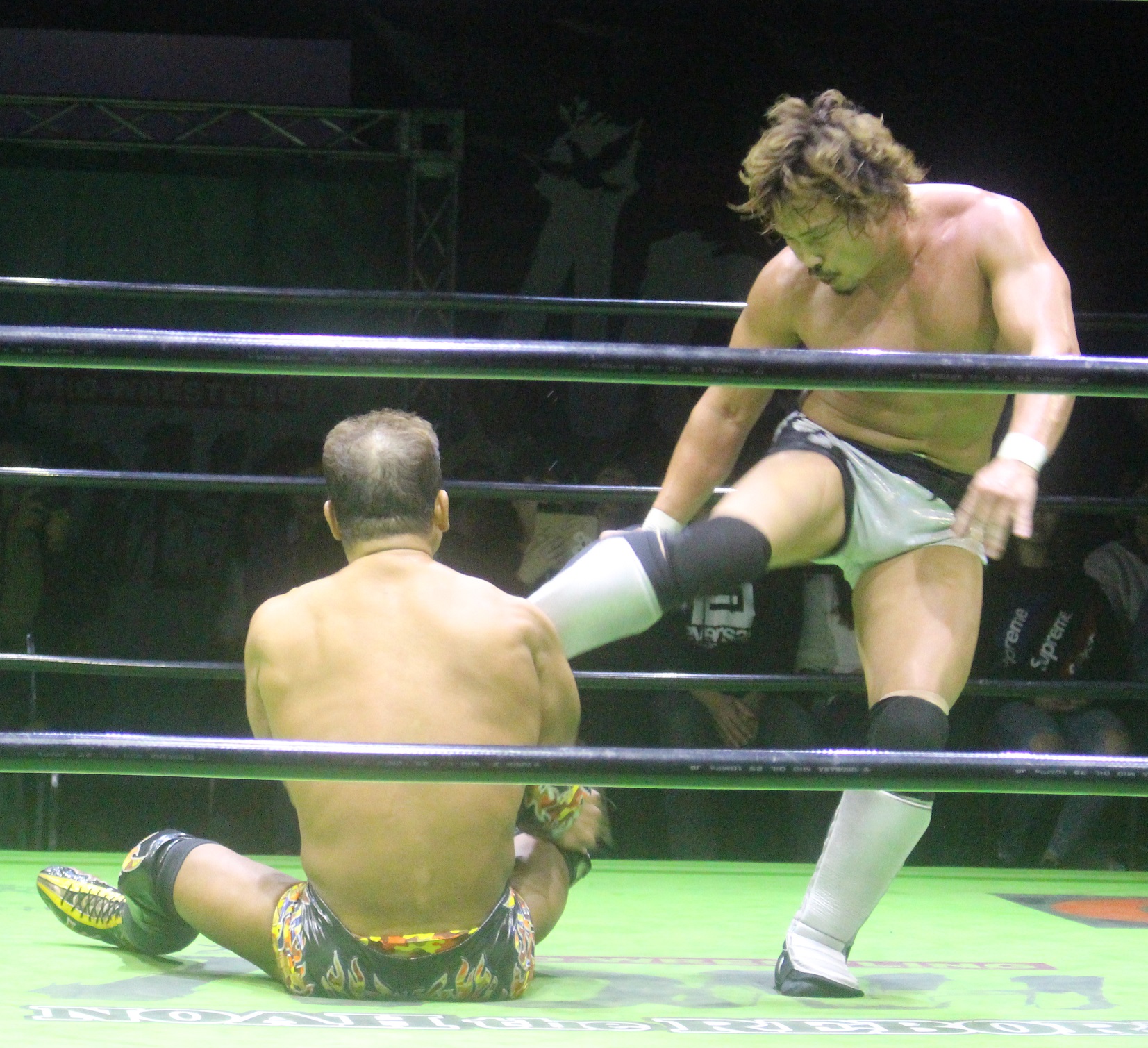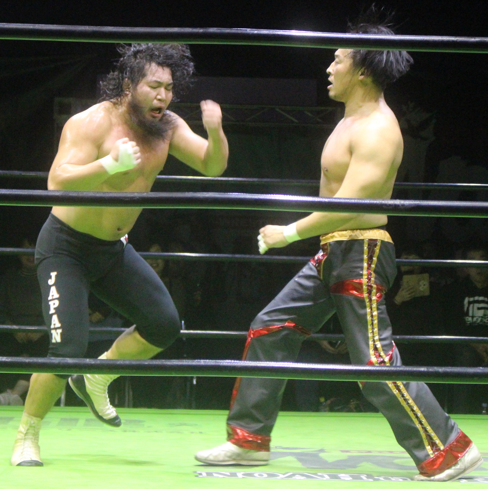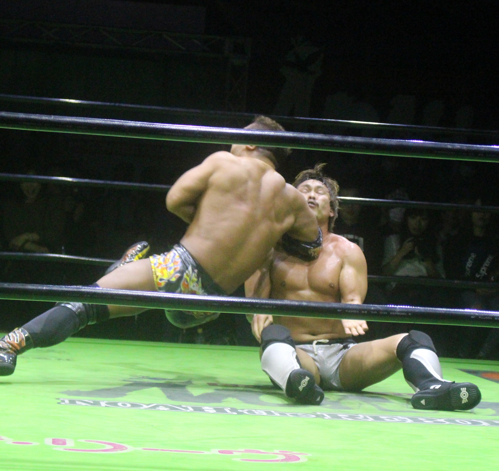 今度はロックアップから拳王が押し込むと、離れ際のハイキック狙いは潮崎がかわして逆水平を乱打すると、拳王もミドルキックの連打で蹴り倒し、サッカーボールキックを浴びせるも、起き上がった潮崎はフライングメイヤーから逆水平、拳王もサッカーボールキックで返すなど意地の張り合いを繰り広げ、場外戦を仕掛けた潮崎は鉄柵攻撃から逆水平で客席まで吹き飛ばすと、鉄柵越えのフライングショルダーを発射、更に場外DDTで突き刺し、拳王がエプロンに立っても、ロープ越しの豪腕ラリアットで吹き飛ばし、リングに拳王を戻してから首筋に手刀を落とす。