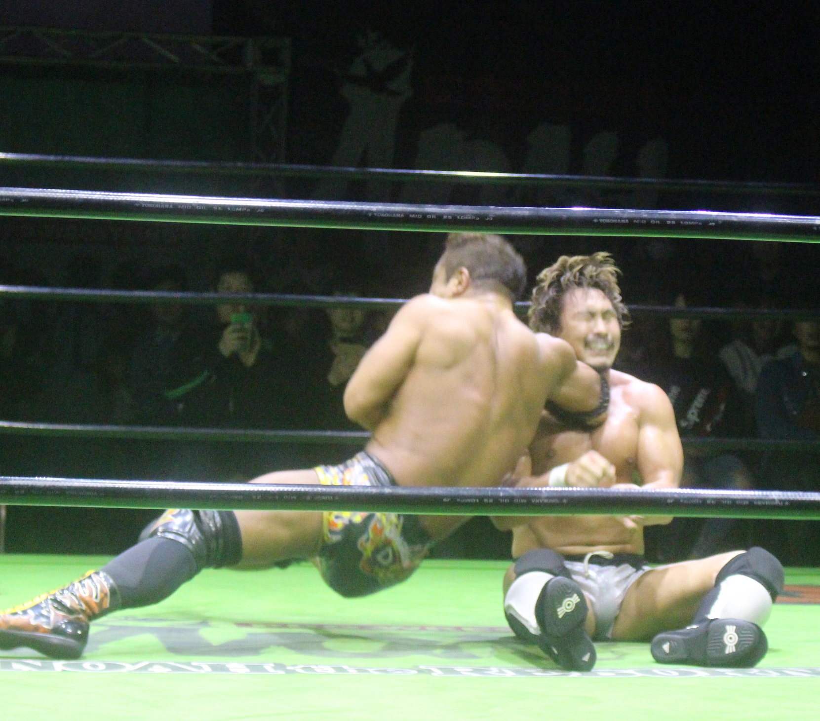 丸藤「危ないから絶対にやらないんだけど、絶対に。だけど、その2つ前ぐらいにいいのがアゴに入ったはずなんだよ、絶対に。写真撮っている人がいるなら見てほしい。絶対いいのが入っているんだよ。それでも立ってきたんだ、あいつは。俺の中でKOしたんじゃないかというぐらいのヒザごたえがあった。でも、立ってきたんだよ、あいつは。したら、これをやるしかねえだろ。もうやらないかもしれない。俺もヒザが悪いからよ、見ての通り。見てくれよ、(ヒザの)テーピングがボロボロに破けちまったよ。でも、初っぱなから手は抜かないぞ、絶対に」