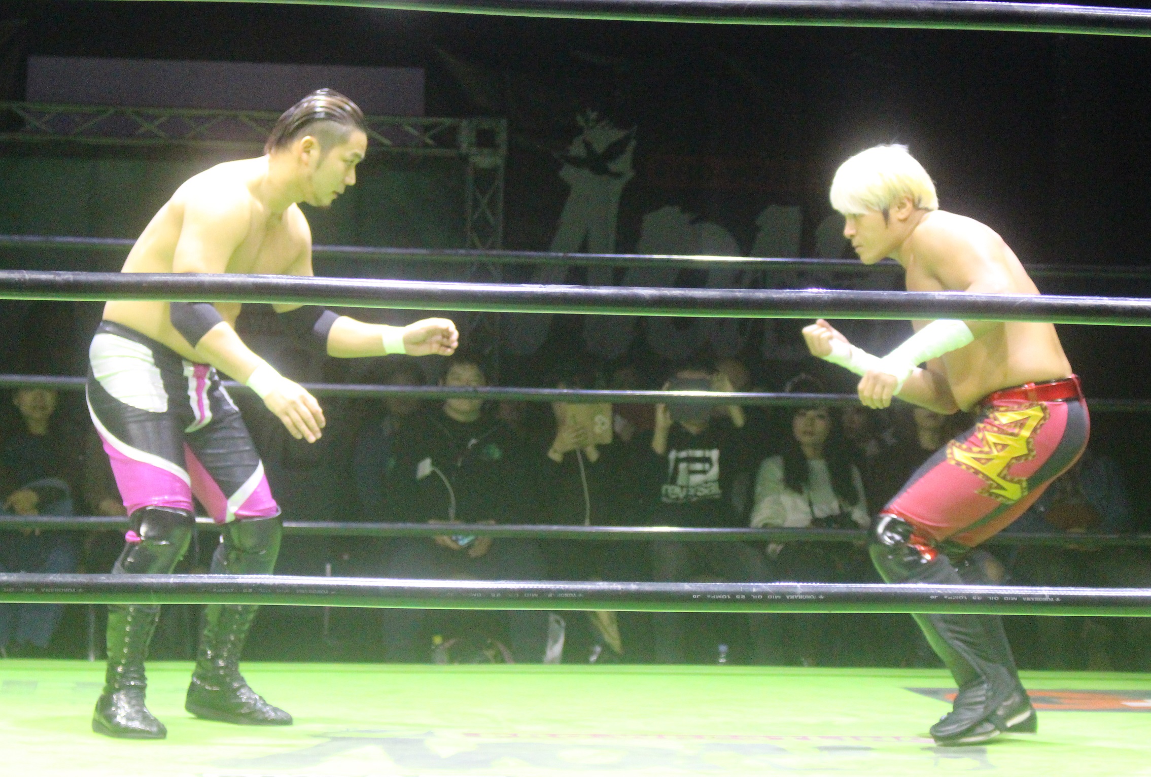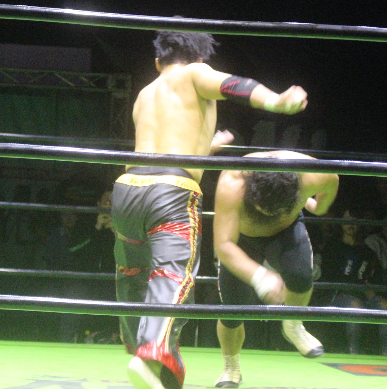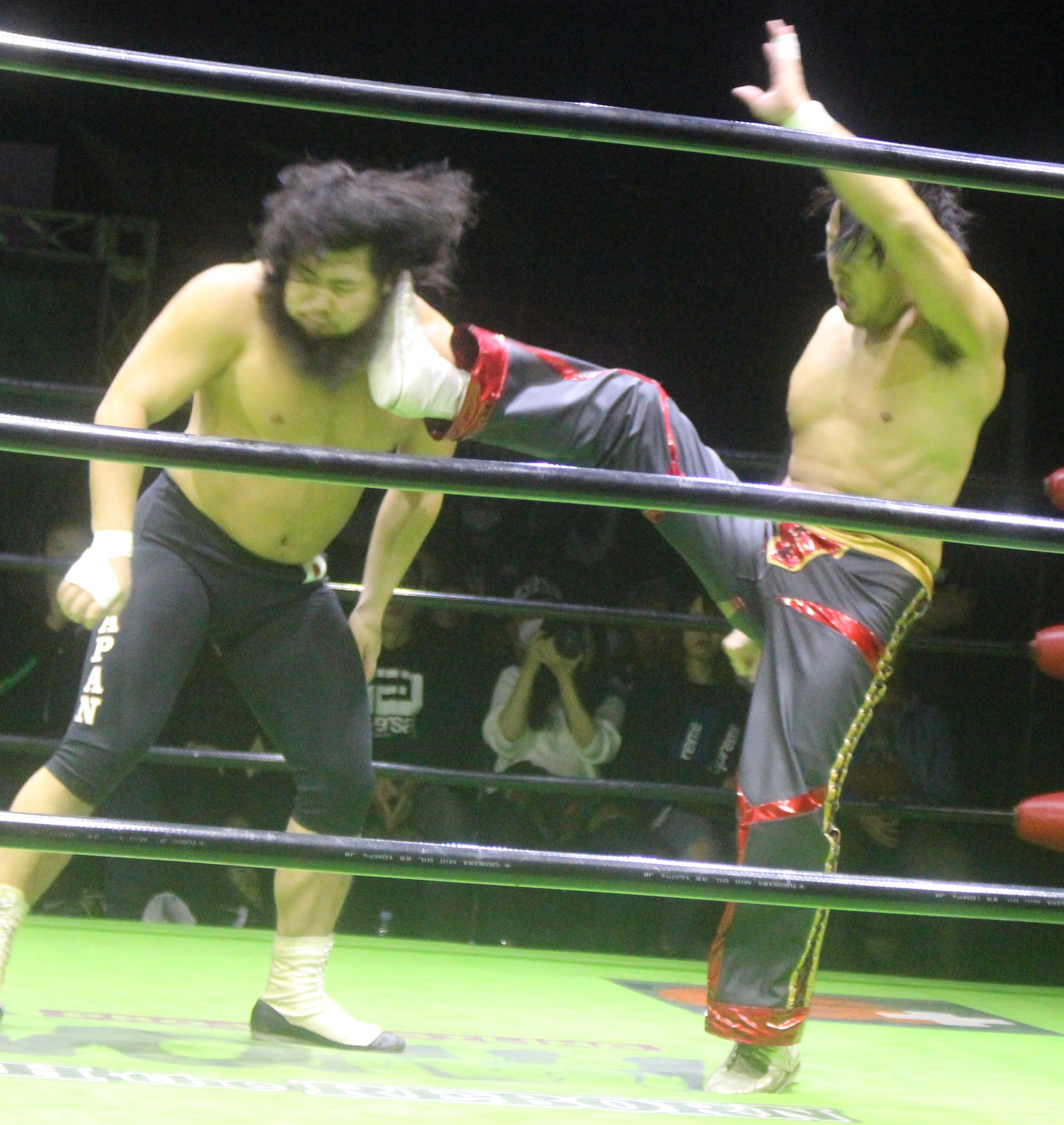 リングに戻った原田は大ダメージを負ったタダスケに対してエルボー合戦を挑み、原田が競り勝ってワンツーエルボーからローリングエルボーを狙うが、タダスケはラリアットで迎撃して、もう一発を狙うも、原田は先にラリアットを炸裂させて迎撃、再びエルボー合戦となってまた原田が競り勝ったが、大きく振りかぶったところで、今度はタダスケがナックルで迎撃する。