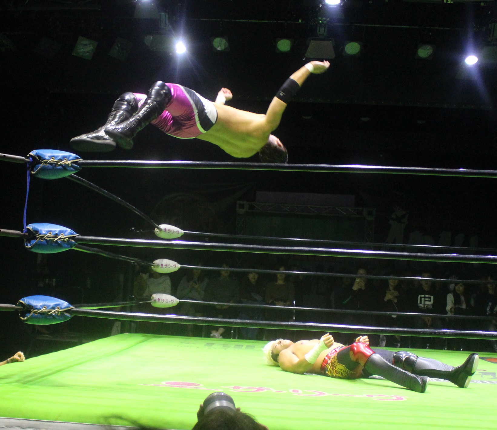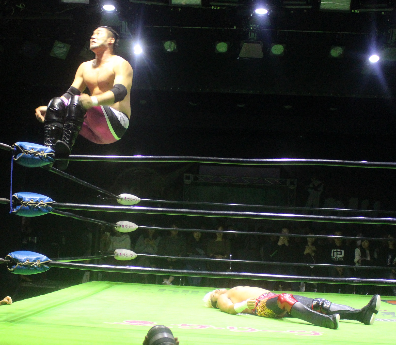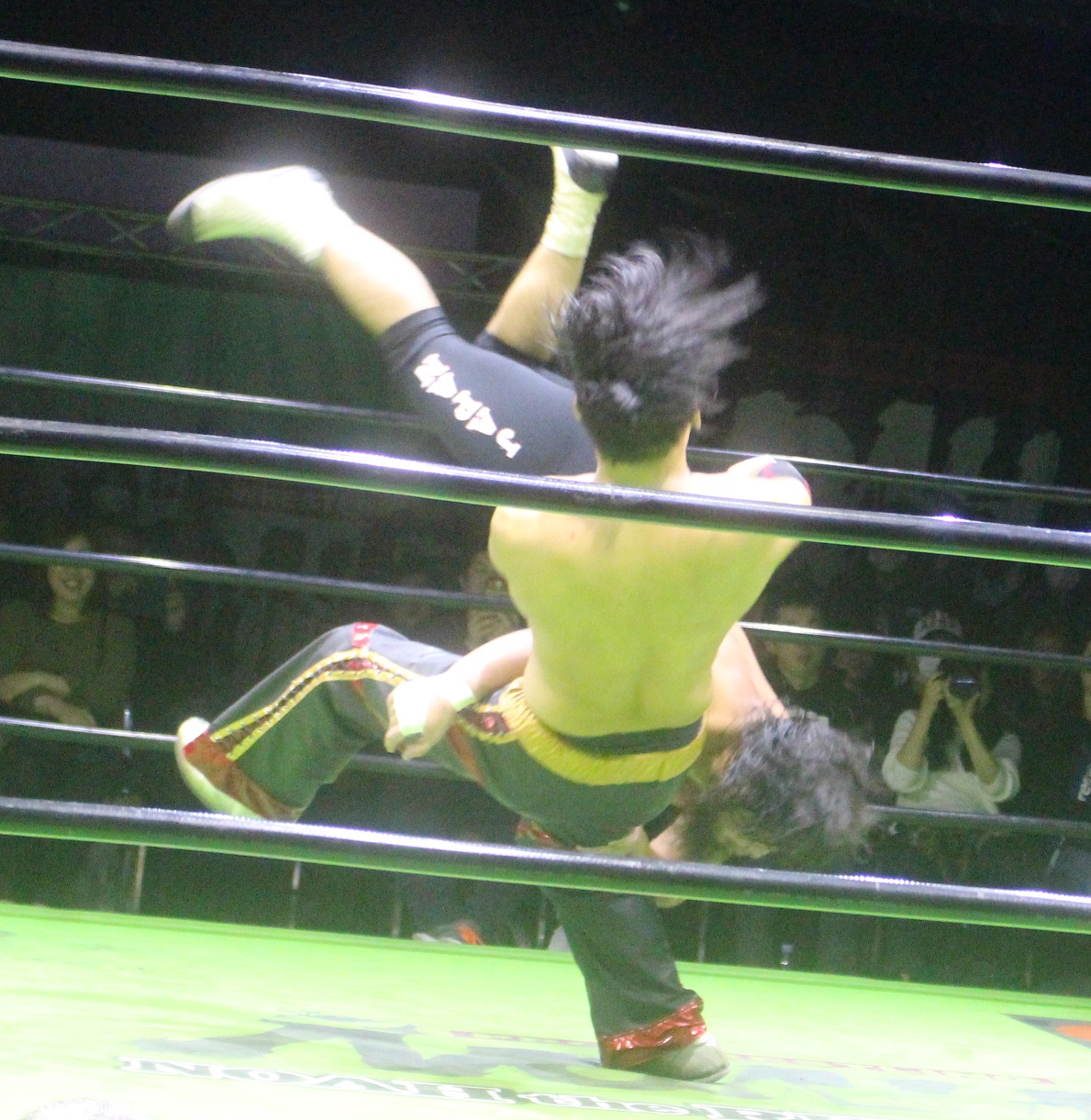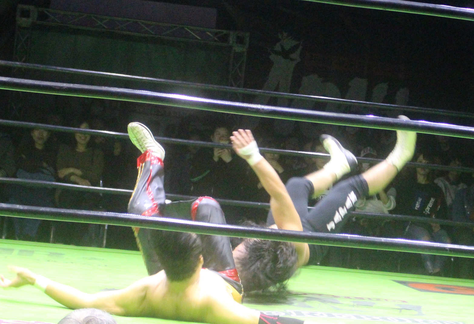 エプロンでの攻防になると原田は断崖式ジャーマンを狙うが、堪えたタダスケは上空ホイップ式パワーボムで反撃、だがリングに戻ってから再び上空ホイップ式パワーボムを狙うと、原田はフランケンシュタイナーで切り返し、場外へ逃れたタダスケを原田はフロントスープレックスで投げ、場外でダウンしているタダスケを原田がコーナー最上段からのダイビングエルボードロップを投下してダメ押しする。