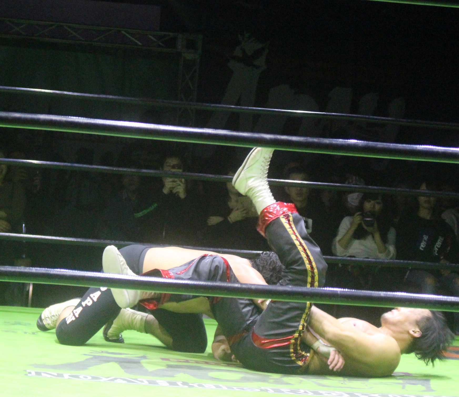 拳王はジャーマンを狙うが、中嶋が堪えると、突っ込んでくる拳王に中嶋がコーナーにセットしてR-15を発射し、コーナー最上段からの雪崩式ブレーンバスターからランニングローキックを狙うも、かわした拳王がアンクルホールドで捕獲、しかし中嶋もアンクルホールドで捕獲してから、掟破りのホイップ式ミドルキックを叩き込み、拳王もドラゴンスープレックスで応戦、両者はフロントハイキック、張り手も相打ちとなってダウンとなる。