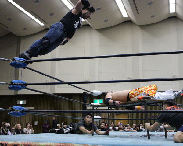 植 木は畳んであるテーブル上でのDDTから、テーブルの上に塚本を寝かせての確保式ダイビングヘッドバットを投下するも自爆、そしてリング下にテーブルを設置してからエプロンでの攻防となると、塚本が断崖式オキャノンボムでテーブルがクラッシュとなり、塚本が勝利となった。
