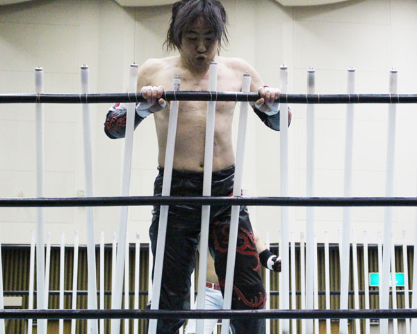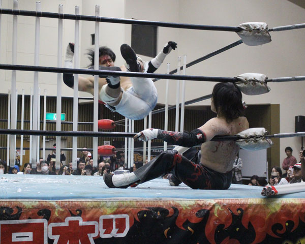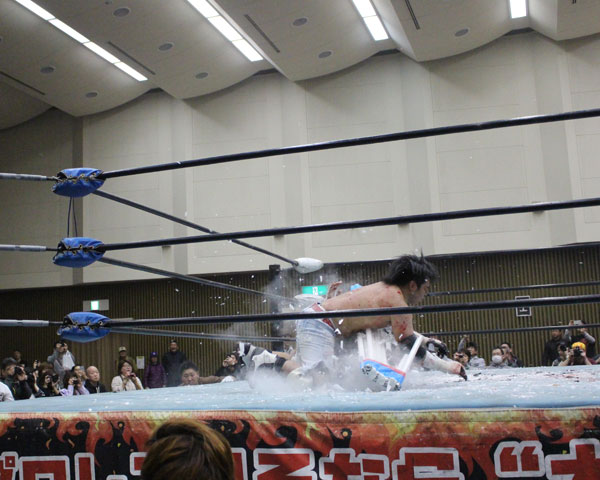 劣勢の佐久田はコーナーを利用しての619で流れを変えると、ミサイルキックでイサミ自ら設置した蛍光灯櫓にクラッシュさせ、イサミをコーナーに座らせてから蛍光灯低空ドロップキックでクラッシュ、しかしライオンサルトは自爆となると、イサミはフライングフォアアーム、だが佐久田も蛍光灯で自ら頭突きでクラッシュさせて気合をいれるとエルボー合戦へ、イサミも頭突きで蛍光灯をクラッシュさせて気合いを入れ打ち返す。