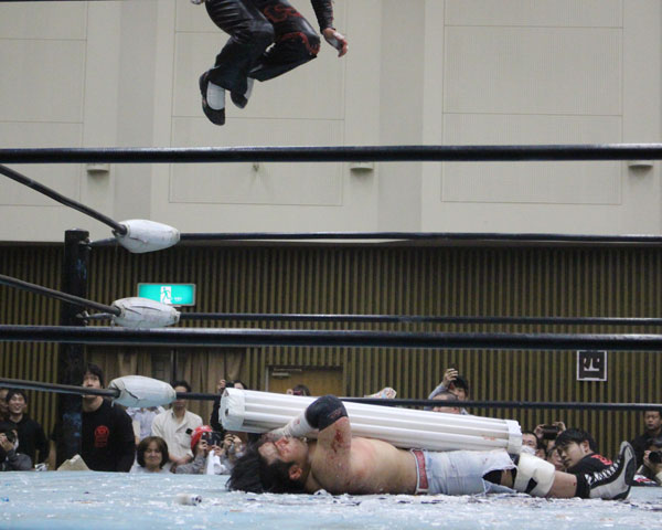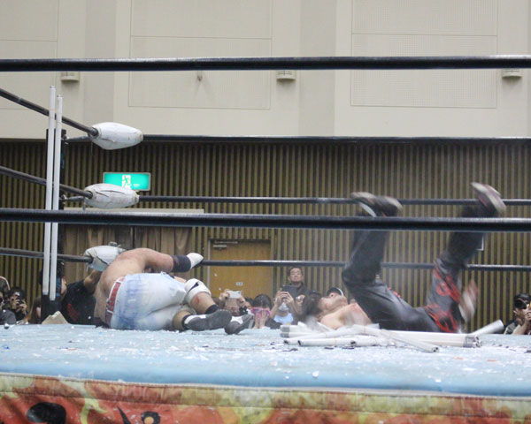 イサミはドロップキックで佐久田をエプロンへ出すと、ロープ越しのミドルキックで蛍光灯ごと佐久田を蹴り、エプロン上でのブレーンバスターを敢行してから、場外に落ちた佐久田を自ら蛍光灯にクラッシュしながらもトペ、リングに戻ってからダイビングボディーアタック、しかし佐久田もイサミ自ら設置した蛍光灯の上に雪崩式フランケンシュタイナーでクラッシュさせ、蛍光灯の上へのスピアーを放つも、イサミも蛍光灯の上へのボディースラムから一旦バックステージへと下がり蛍光灯束を持ち込み、ダウンしている佐久田にセットしてからダイビングダブルニードロップを投下、蛍光灯束もクラッシュとなるが佐久田はカウント2でキックアウトする。