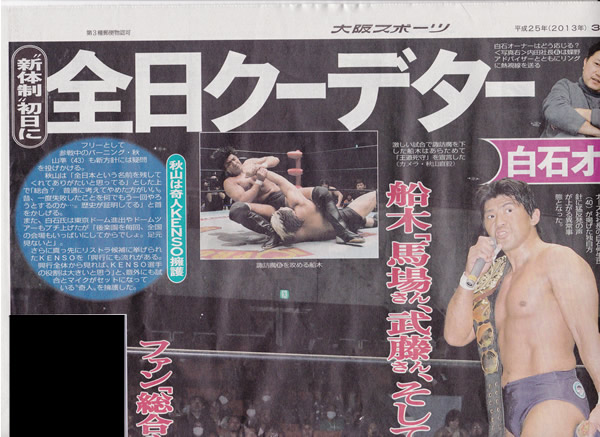 東京スポーツ誌上で全日本プロレス3月10日の後楽園大会の記事が掲載されたが、白石伸生新オーナーに対してファンや現場サイドはNOという返事を出した内容だった。