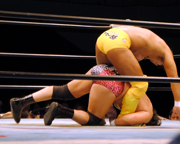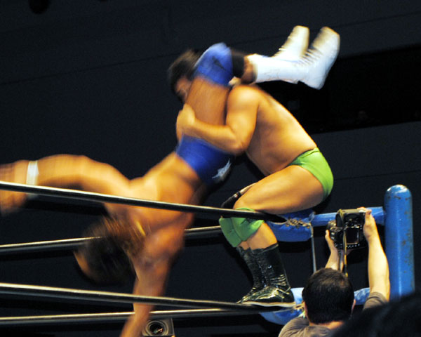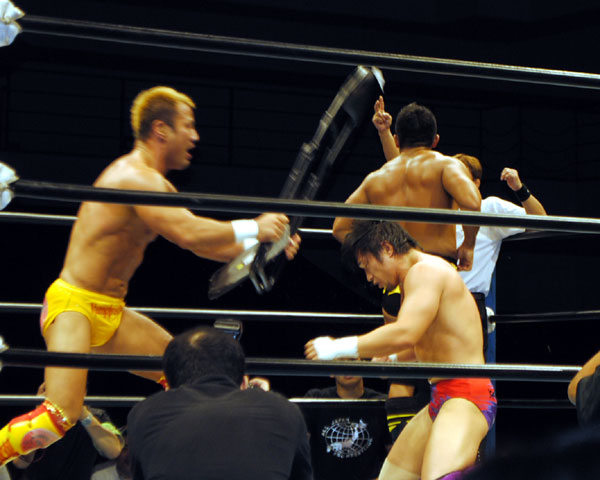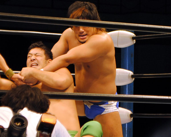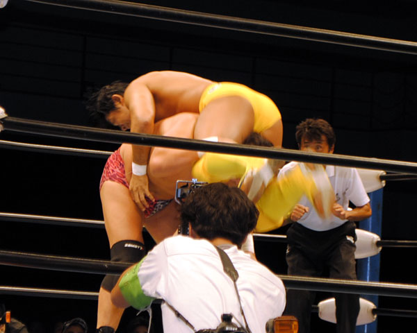 他の試合を振り返ると第1試合では大和ヒロシ、近藤修司のジュニア王者コンビがカズ・ハヤシ、MAZADA組と対戦、しかし全日本のリングでGHCジュニアのベルトを拝めるとは思っても見なかったが・・・試合のメインテーマは全日本ジュニアの盟主を気取り始めた大和と快く思ってないカズの絡みで両者は激しくぶつかり合う、試合は大和がMAZADAをクロスアームスープレックスで降したが、試合後にGHCジュニア王座挑戦が決まっているNOAHの青木篤志が乱入し近藤に脇固めを決めるだけでなく、制止に入った大和にも脇固めを決める暴挙を働いたため館内は大ブーイング、まさか青木が名古屋に来ているとは思わなかったが、勢いでやってしまったのかもしれないけど大和にまで脇固めを決める必要があったのか・・・