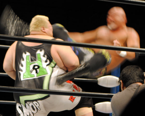 第6試合の武藤敬司 スコット・ノートンvs太陽ケア、浜亮太は久しぶりに見るノートンは老けた感じになってしまったが恐竜パワーは健在、浜相手に肉弾戦を展開しても打ち負けはせずパワーで押し捲っていた、試合は武藤が捕まる展開が多かったもののノートンの援護を受けた武藤が浜をシャイニングウィザードで降し勝利、なおノートンは今後も全日本に参戦するという。