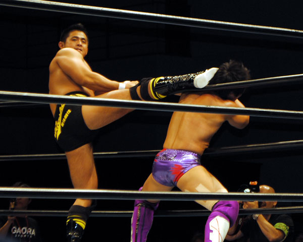 メインの三冠統一ヘビー級選手権(王者)船木誠勝vs(挑戦者)大森隆男は、試合は早くも船木の浴びせ蹴りが炸裂すると船木がハイブリットブラスターを狙うが、阻止した大森も船木のミドルキックをキャッチしてアックスギロチンドライバーを狙うなど互いに速攻勝負狙いとなる。