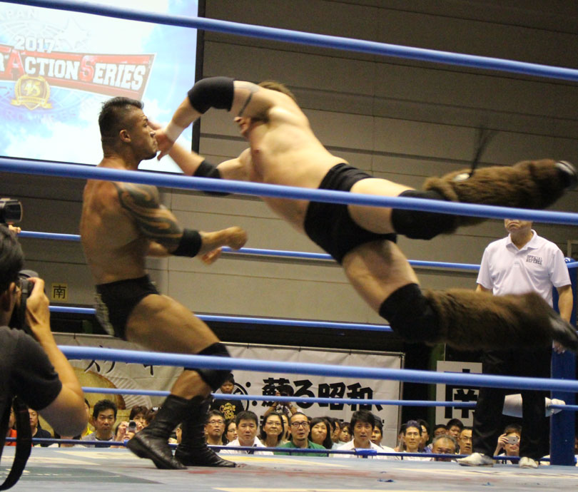 宮原は諏訪魔の右腕にフロントハイキックを連打するも、諏訪魔は左のラリアットからバックドロップ、そして奥の手であるバックドロップホールドで3カウントを奪い勝利を収める。