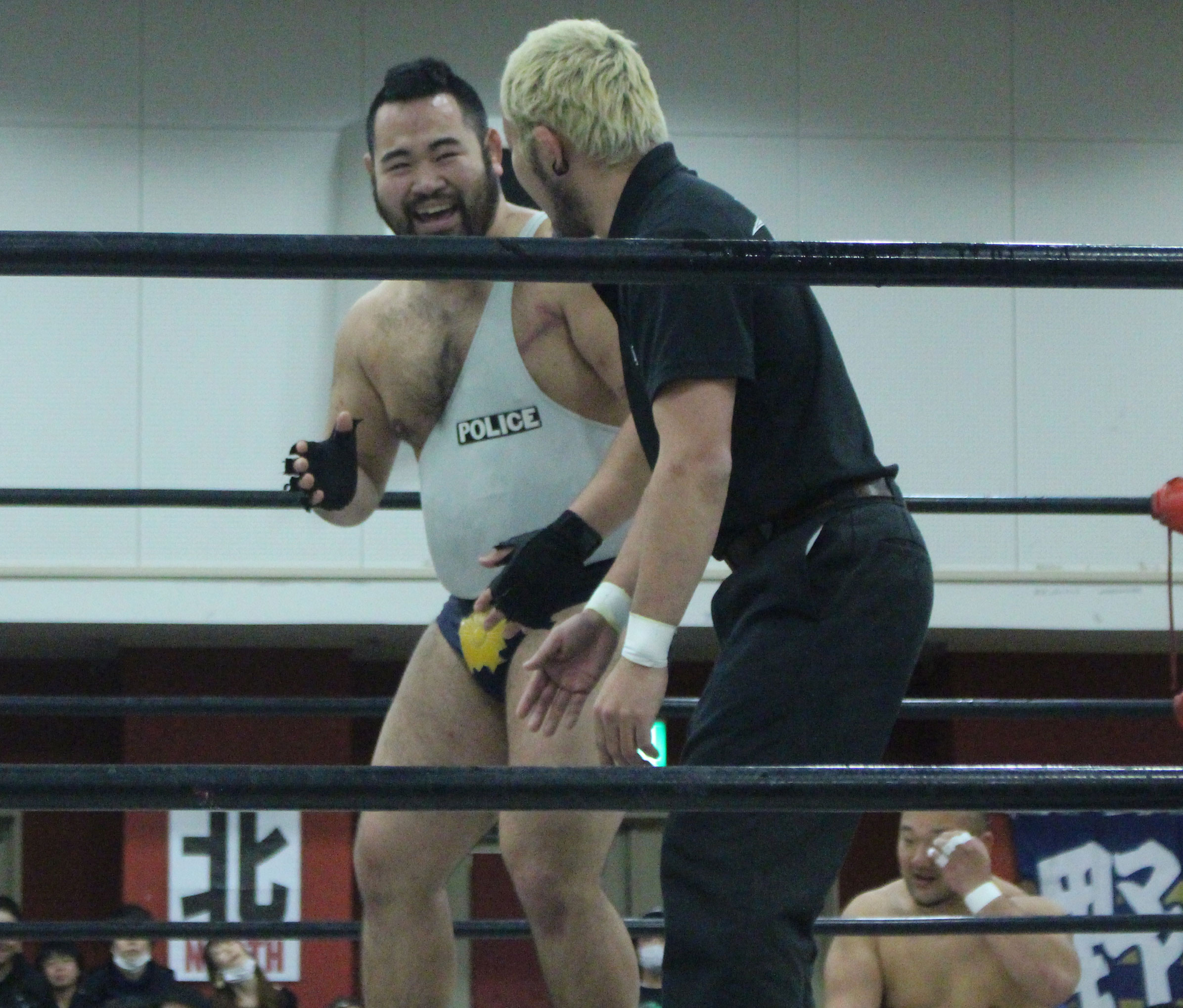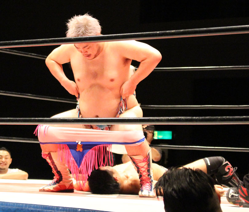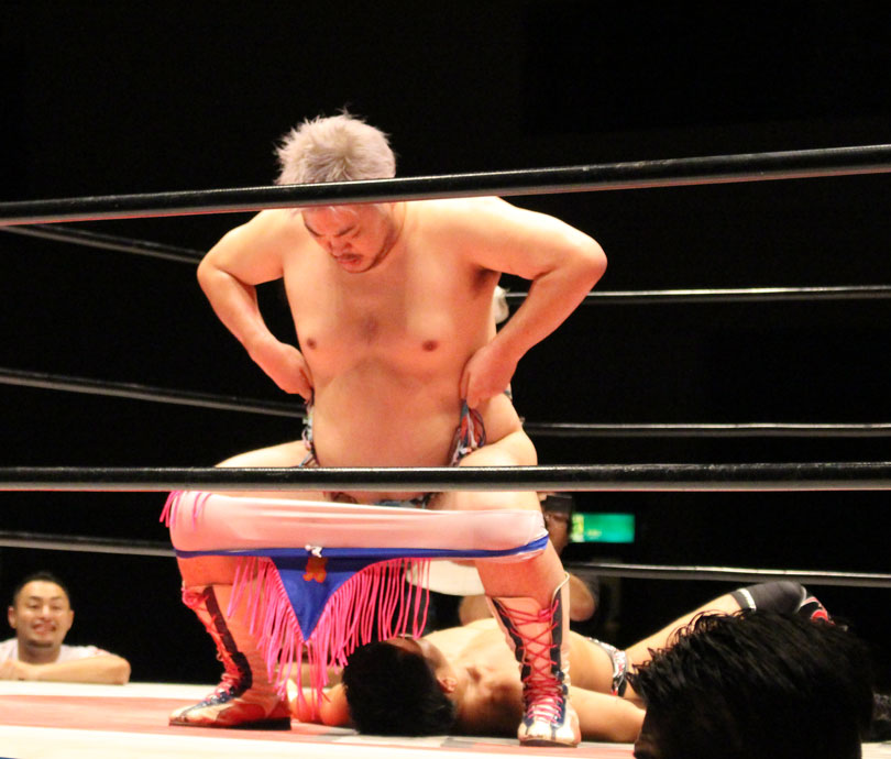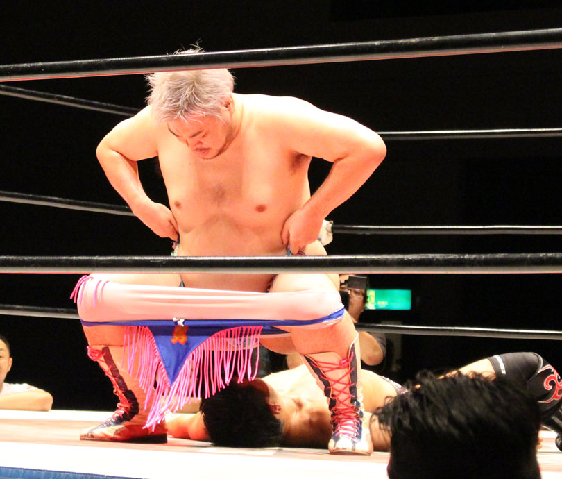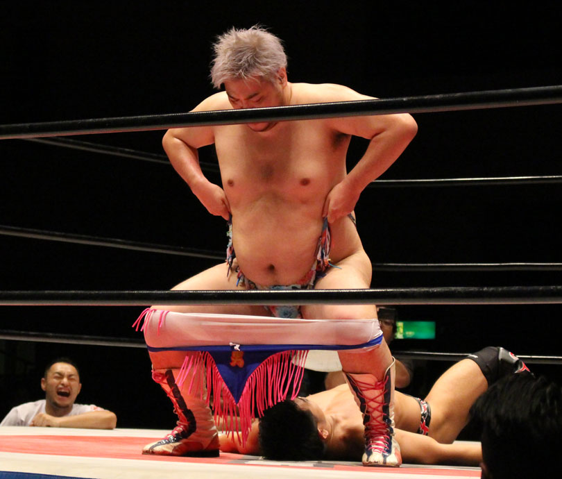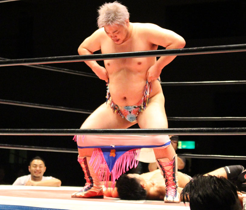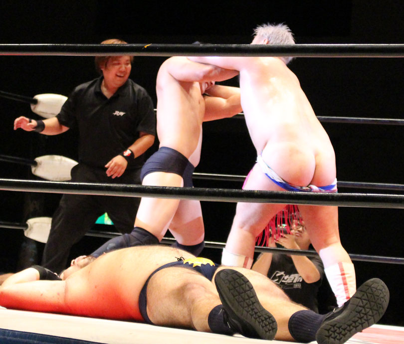 再三窮地に立たされた小鹿はやっとアブ小に交代、アブ小は猛反撃し、蘇生した小鹿も佐久田にダブルアームスープレックスを決めるなどして援護、最後はアブ小が佐久田に逆エビ、小鹿が星野にコブラツイストの競演を披露し勝利を収める。第4試合では前日のSAMURAI TVバトルメンでも元井美貴さんを精神攻撃で圧勝し、翌日に高木三四郎との対戦を控えるDDTのディーノが登場し植木とコックポリスを結成して、野村&吉野のイケメンコンビと対戦。ディーノが試合前に二人を品定めしたことで野村が先発を嫌がって吉野が先発、コックポリスも植木が先発し、植木は吉野が30代であることを暴露しつつじっくり密着、吉野は野村に交代するとディーノが登場、ディーノは早くも野村を嬲り、野村は吉野に助けを求めるが、吉野は逃げ、嬲られつつも野村は押し付けるかのように吉野に代わると、吉野はディーノのケツ堀り、植木の胸毛ウォッシュ、ディーノからTバックやナイトメアの餌食にされる。