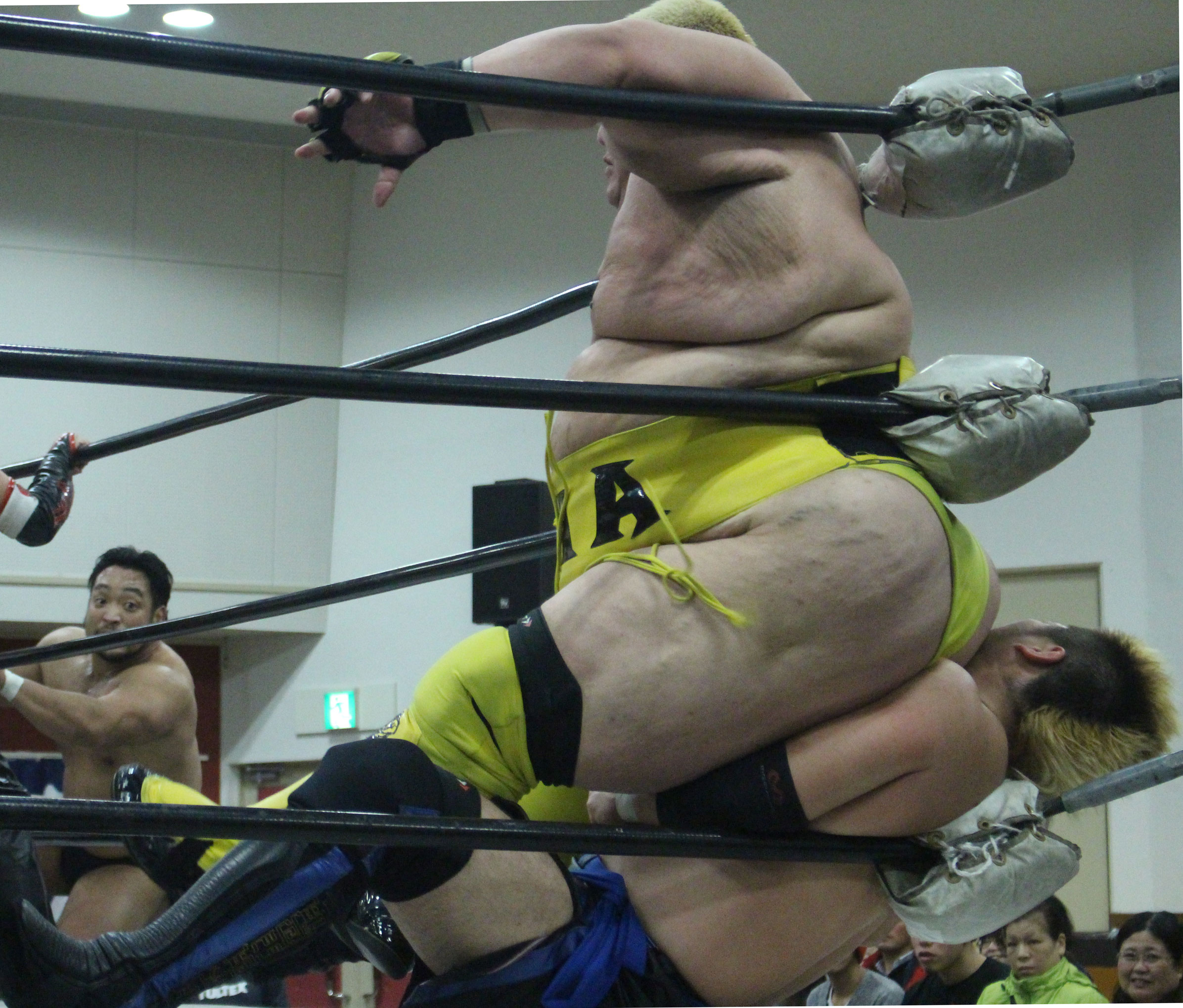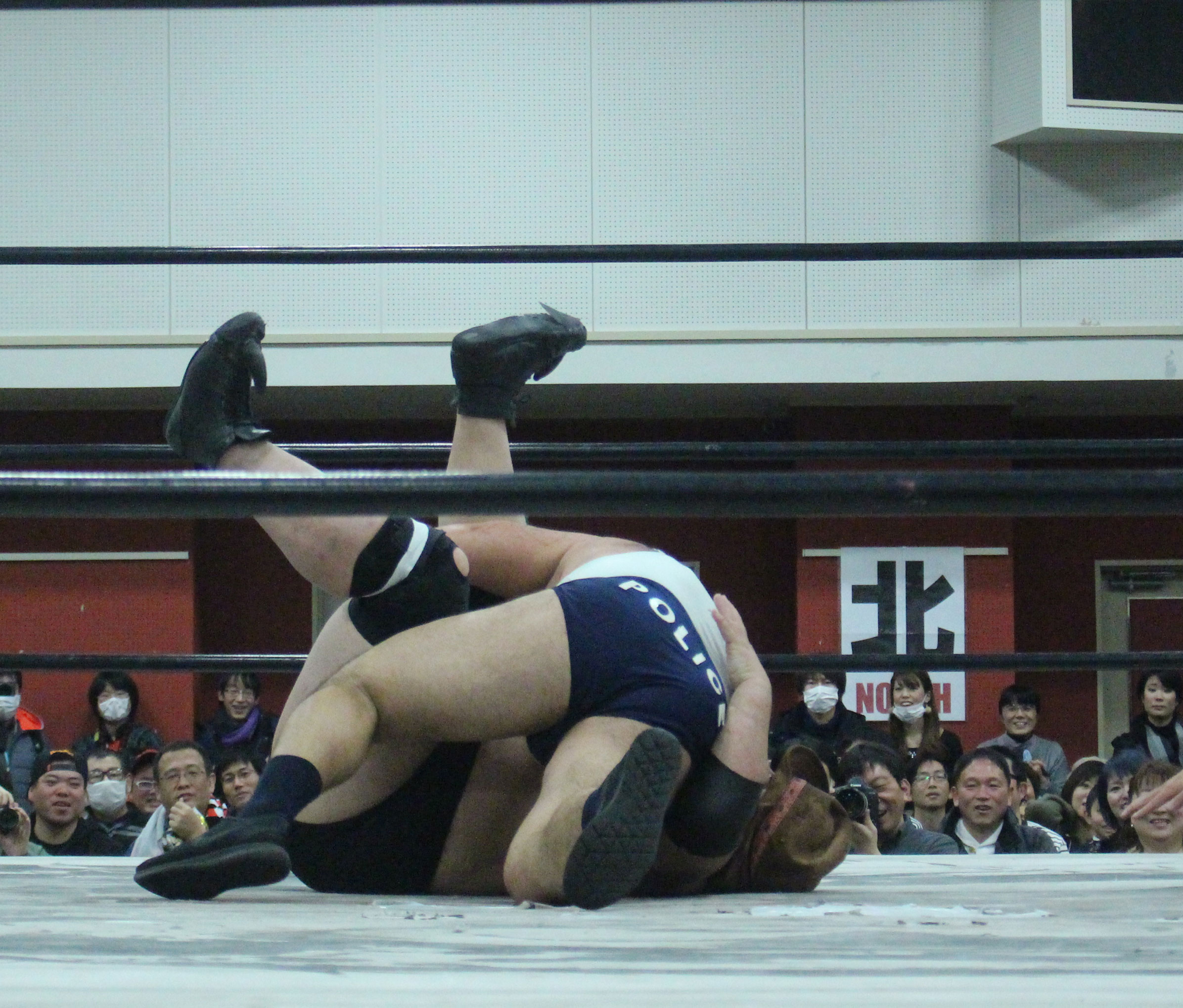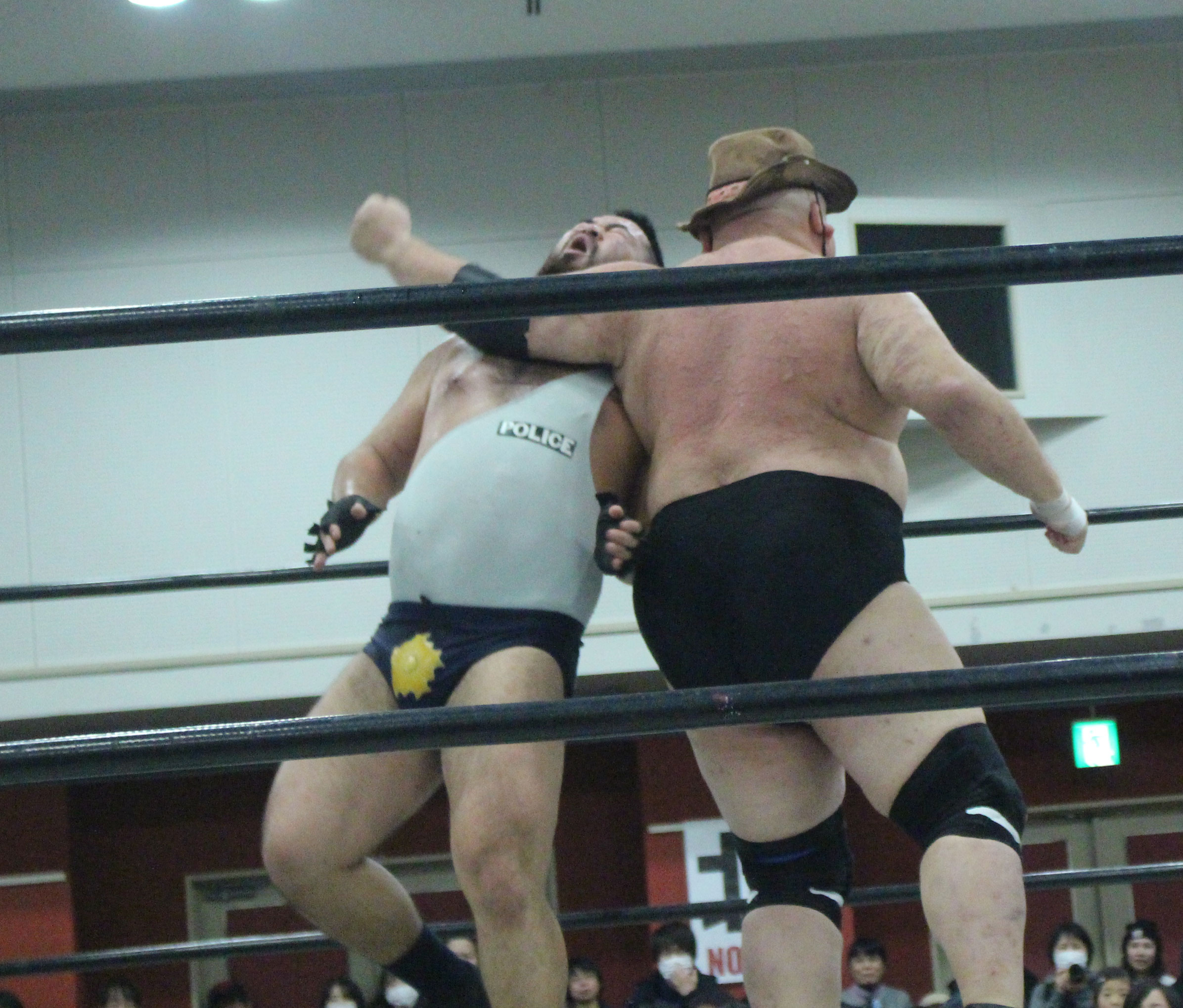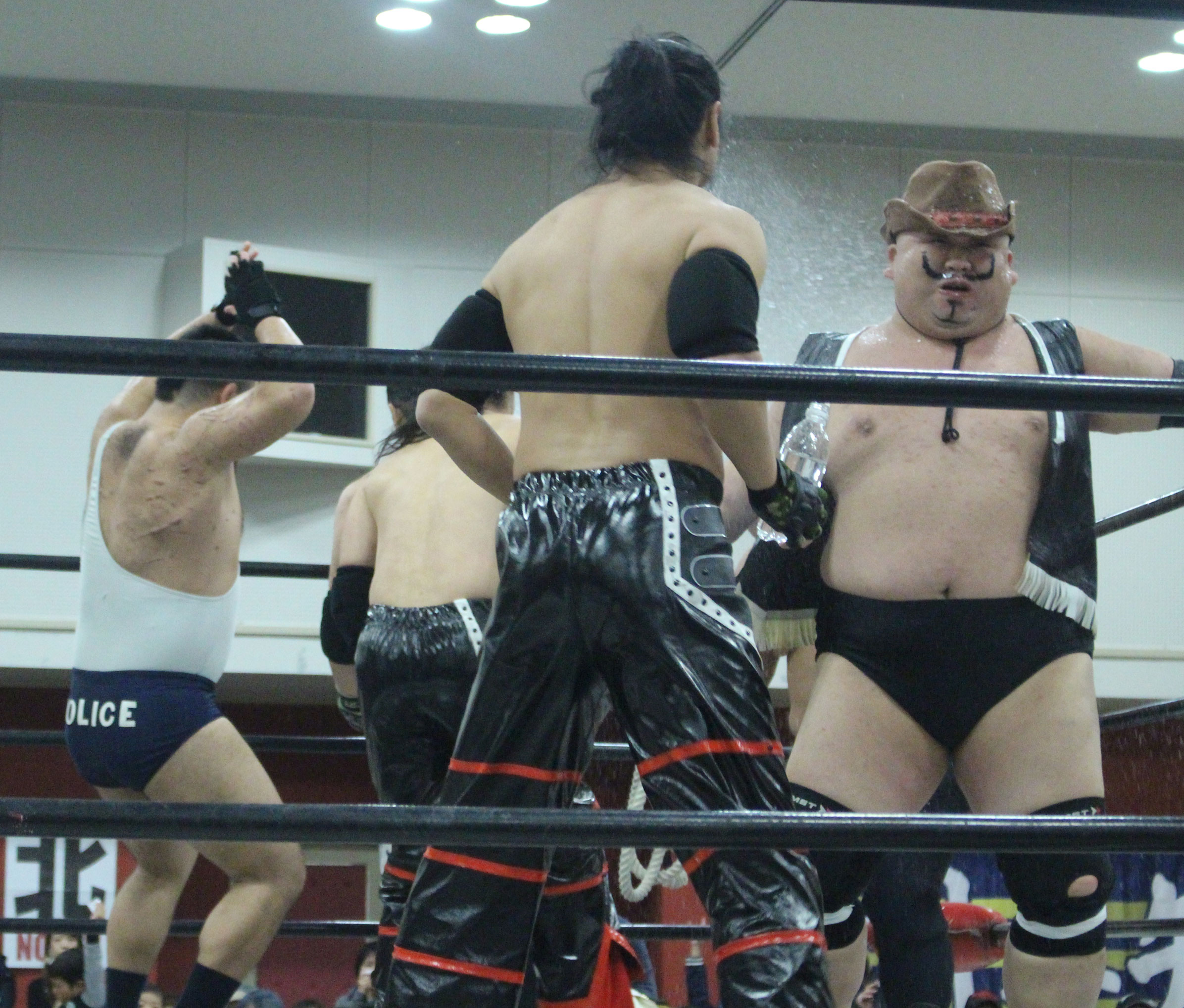 再三窮地に立たされた小鹿はやっとアブ小に交代、アブ小は猛反撃し、蘇生した小鹿も佐久田にダブルアームスープレックスを決めるなどして援護、最後はアブ小が佐久田に逆エビ、小鹿が星野にコブラツイストの競演を披露し勝利を収める。第4試合では前日のSAMURAI TVバトルメンでも元井美貴さんを精神攻撃で圧勝し、翌日に高木三四郎との対戦を控えるDDTのディーノが登場し植木とコックポリスを結成して、野村&吉野のイケメンコンビと対戦。ディーノが試合前に二人を品定めしたことで野村が先発を嫌がって吉野が先発、コックポリスも植木が先発し、植木は吉野が30代であることを暴露しつつじっくり密着、吉野は野村に交代するとディーノが登場、ディーノは早くも野村を嬲り、野村は吉野に助けを求めるが、吉野は逃げ、嬲られつつも野村は押し付けるかのように吉野に代わると、吉野はディーノのケツ堀り、植木の胸毛ウォッシュ、ディーノからTバックやナイトメアの餌食にされる。