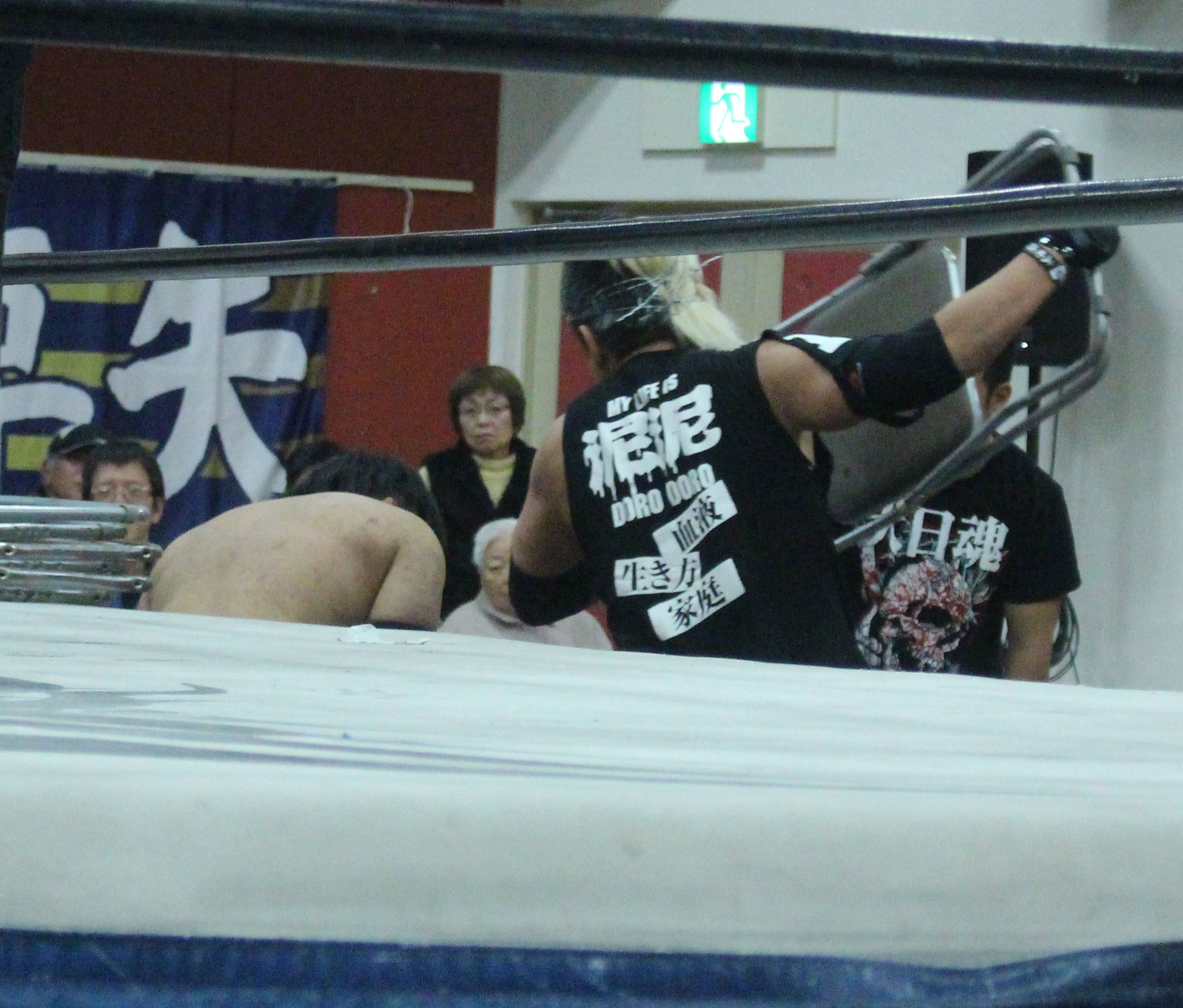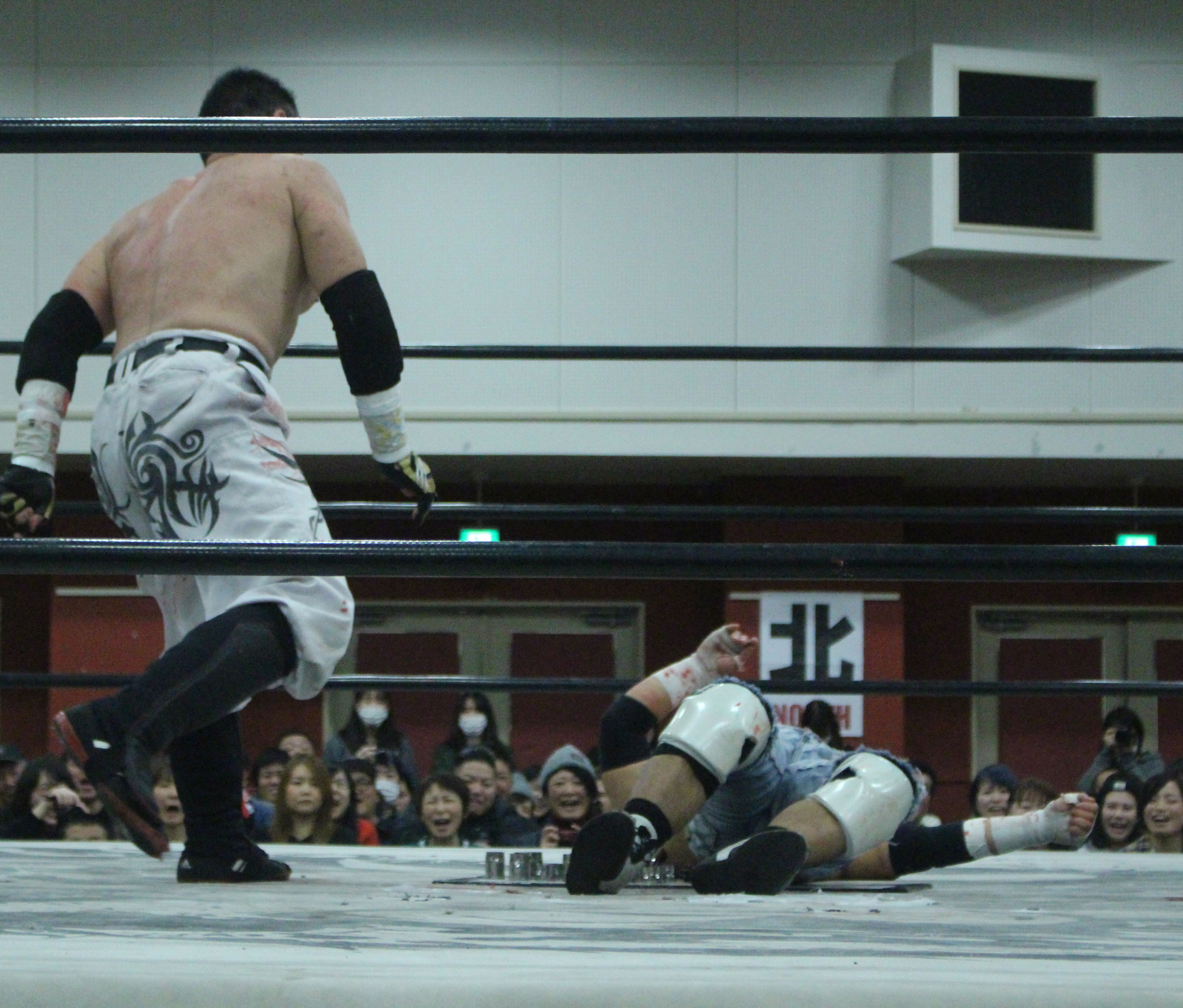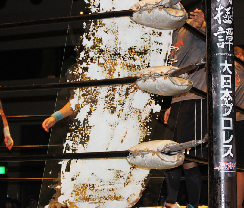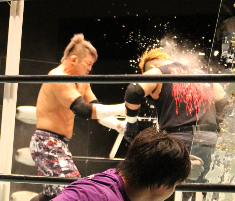 自分的には父である橋本真也もこの名古屋の地で初めてIWGPヘビー級王座を奪取したことで、親子二代でのシングル初戴冠に期待したが、現実は甘くはなかった。序盤までは大地がしっかりリードしていたが、鈴木は後手ながらも一気に抜き去っていった。しかし大地が敗れたことで現時点では挑戦者不在の状態、果たしてこの強いストロング王座に誰が挑むのか…メインのデスマッチ選手権は大日本に正式入団したばかりの高橋に竹田が挑戦、試合形式も蛍光灯+ガラスダブルボードデスマッチとされていたが、一枚のガラスには急遽決定したのか画鋲が仕込まれることになり、急遽製作されたせいなのかガラス板に接着剤らしきもので貼られている画鋲がぽとぽと落ち始める。