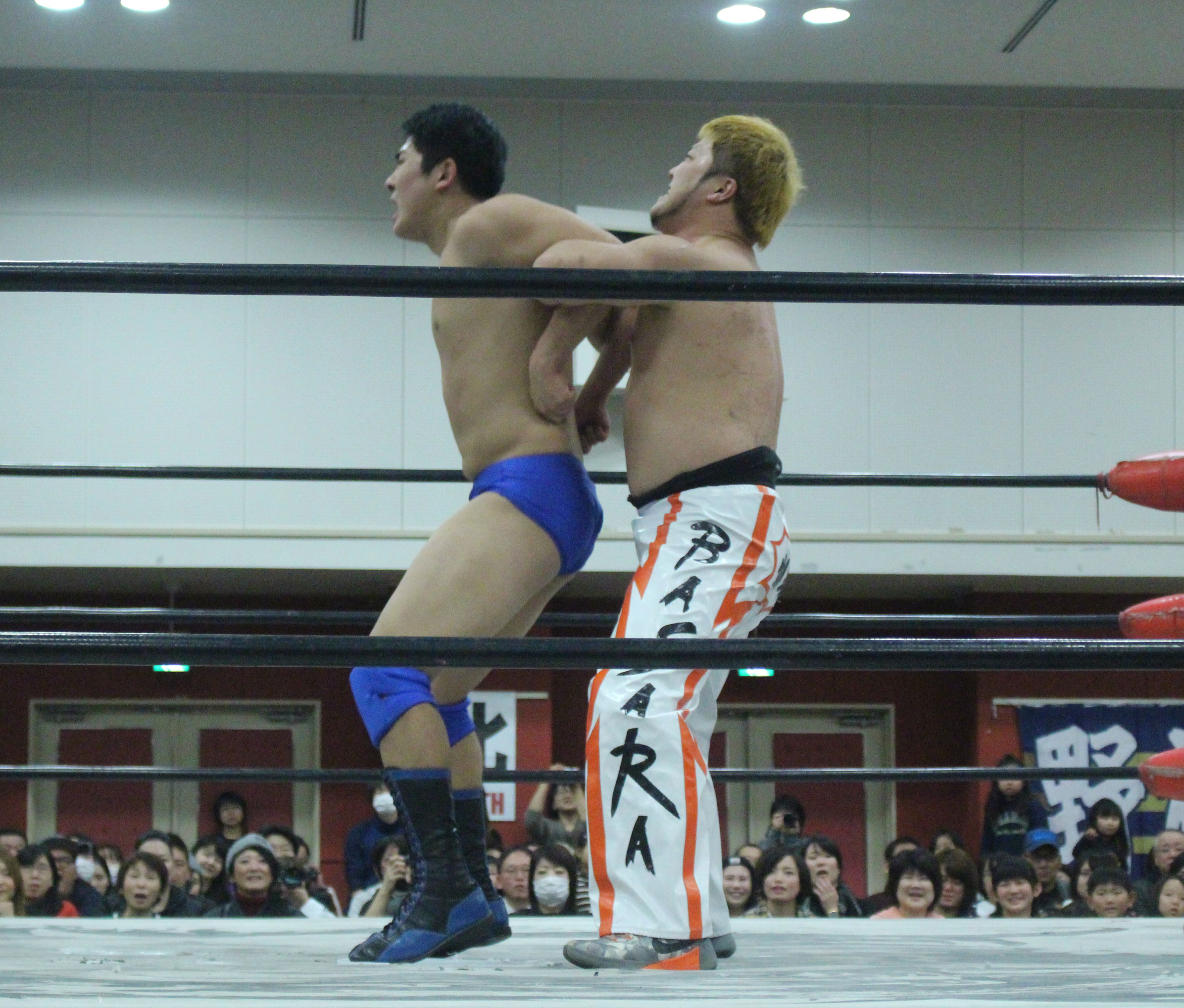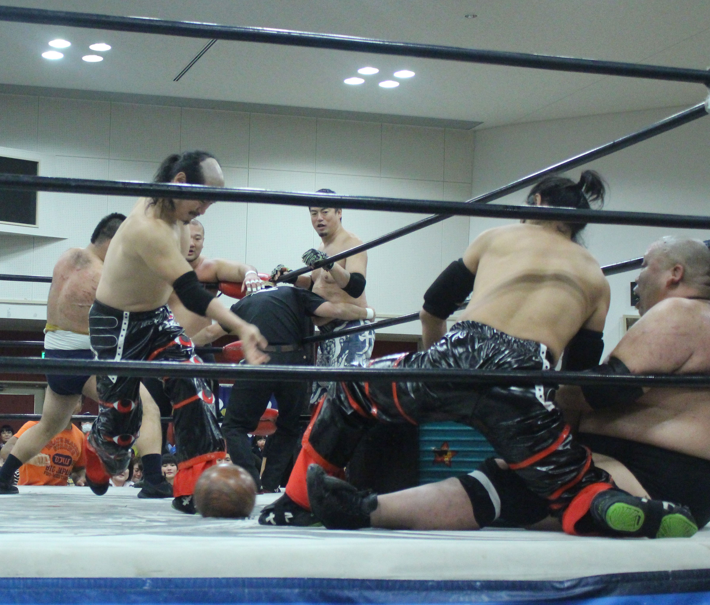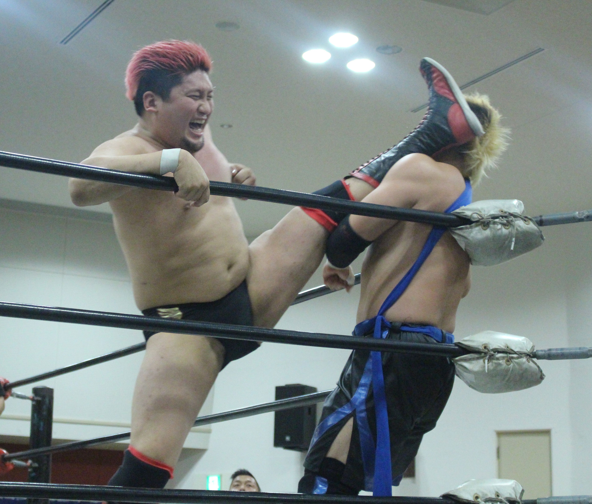 自分的には父である橋本真也もこの名古屋の地で初めてIWGPヘビー級王座を奪取したことで、親子二代でのシングル初戴冠に期待したが、現実は甘くはなかった。序盤までは大地がしっかりリードしていたが、鈴木は後手ながらも一気に抜き去っていった。しかし大地が敗れたことで現時点では挑戦者不在の状態、果たしてこの強いストロング王座に誰が挑むのか…メインのデスマッチ選手権は大日本に正式入団したばかりの高橋に竹田が挑戦、試合形式も蛍光灯+ガラスダブルボードデスマッチとされていたが、一枚のガラスには急遽決定したのか画鋲が仕込まれることになり、急遽製作されたせいなのかガラス板に接着剤らしきもので貼られている画鋲がぽとぽと落ち始める。