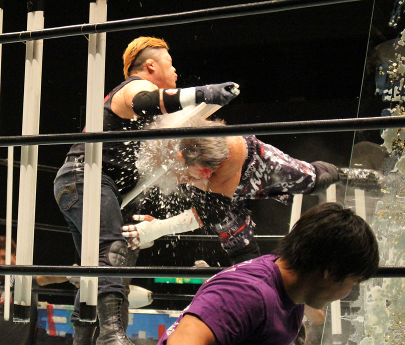 挑戦者の竹田は蛍光灯束を持参して登場、両者はガラス板めがけて牽制し合い、そして蛍光灯を持ち合って殴打し合うと、競り勝った高橋が場外戦に持ち込み、イスで殴打、竹田は早くも流血、リングに戻っても高橋が蛍光灯で何度も殴打し先手を奪ったかに見えたが、竹田が蛍光灯を持った高橋に起死回生のスピアーを浴びせ、イスを使っての顔面整形攻撃からイスをセットしてガラスを設置し、その上へのエクスプロイダーを狙うが、下へ着地した高橋が竹田をパワーボムでガラスボードにクラッシュさせ、大暴走から蛍光灯櫓を作り、その上へのアトミックドロップで叩きつけようとする。