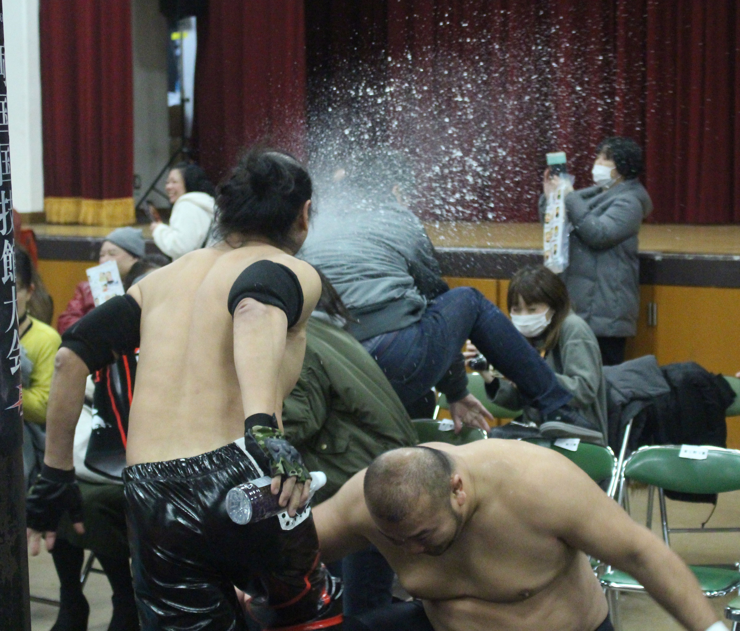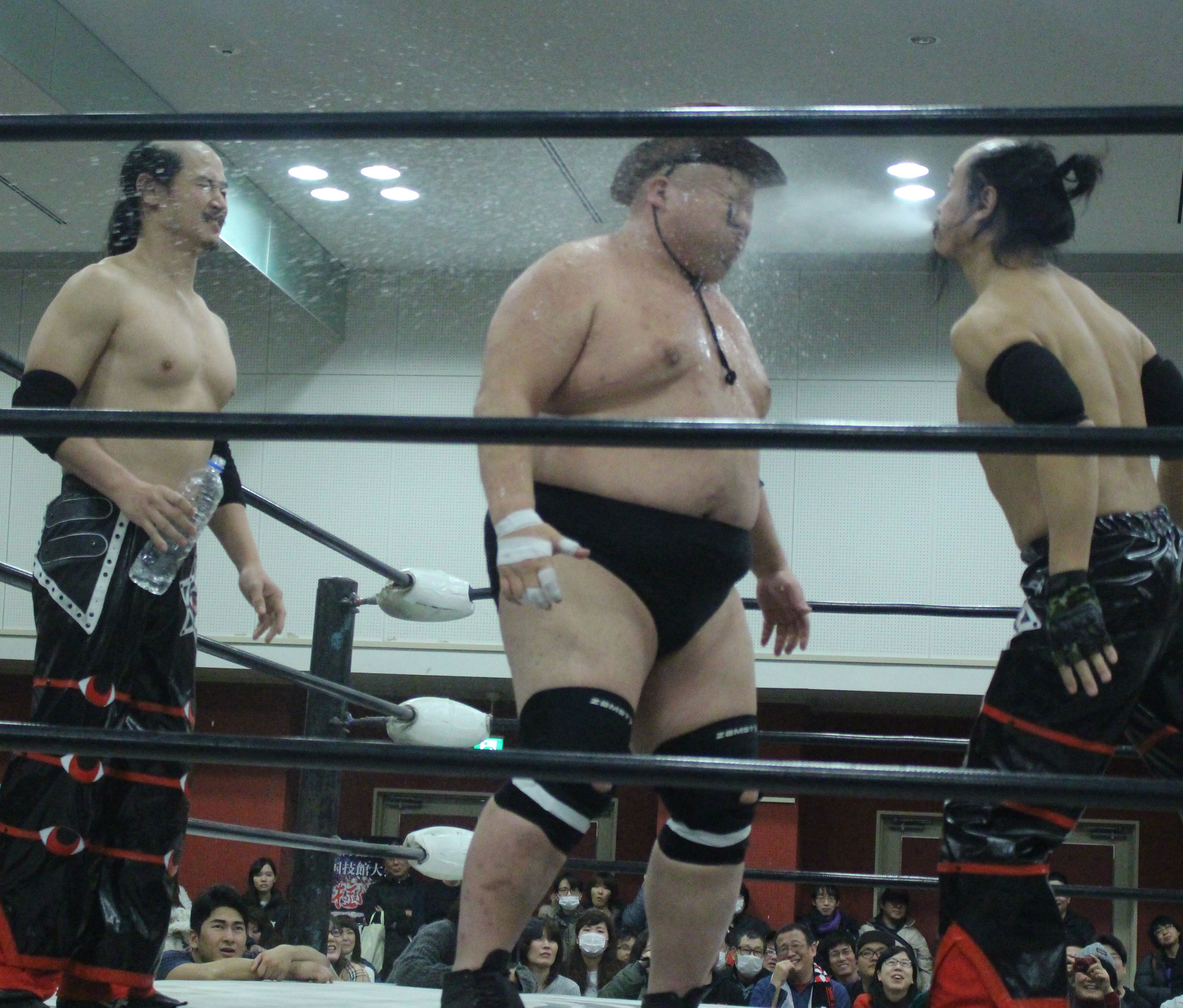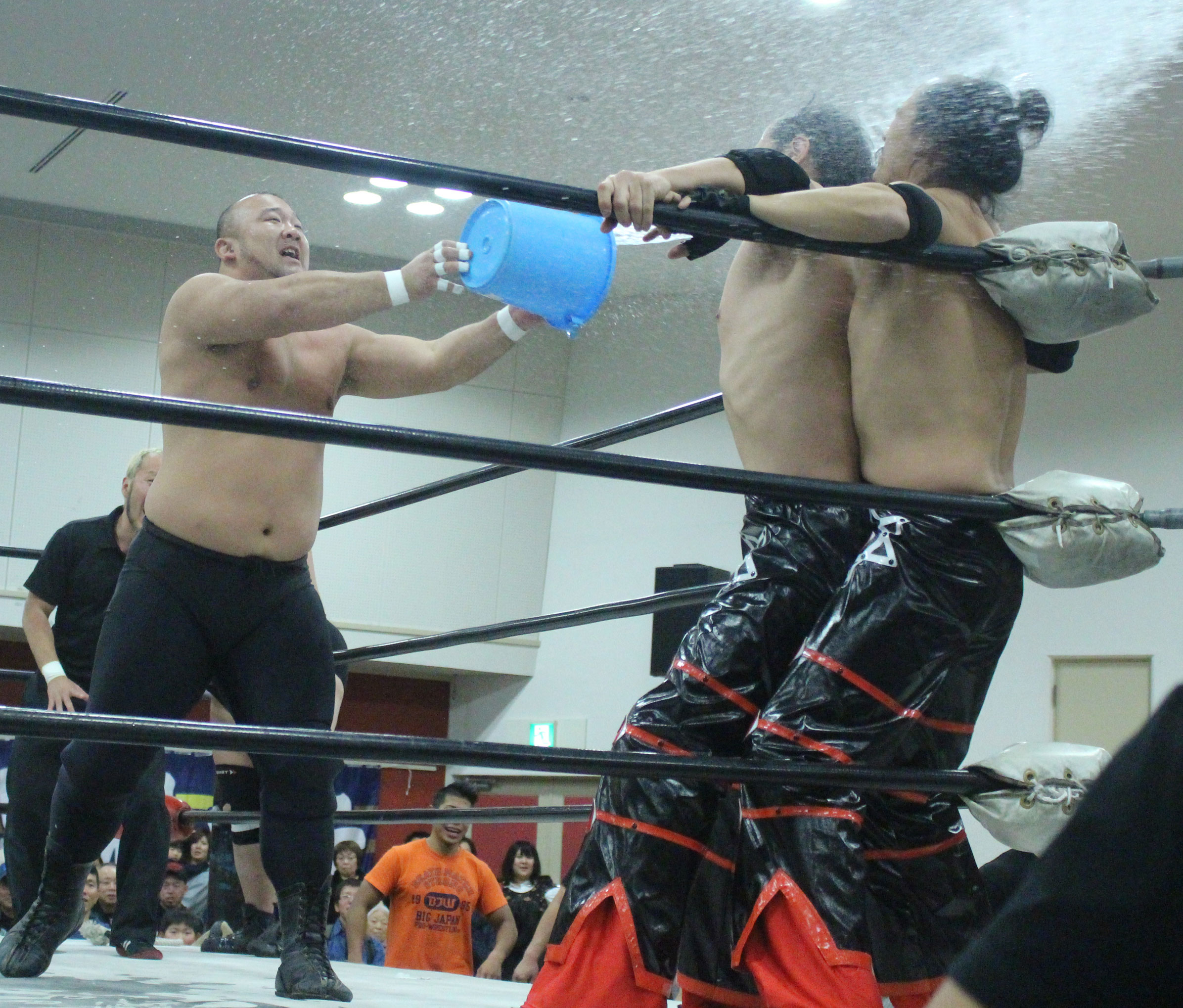 現地へ到着するも周囲は大雨、開場となったが確かにリングの上に屋根があるものの、風もあったため雨除けにもならない。自分は昨年の準備不足の教訓を生かして雨合羽を持ってきたが、本来ならメインだけの予定が第1試合から着用、カメラもビニールを被せるなどして対応を余儀なくされ、自身が座る席もちょうど風が強く吹く位置だったため、全身ずぶ濡れ、雨合羽も雨が染みてきたため既に役に立たなくなった。メインで行われた「ポセイドンアドベンチャースプラッシュ」は風は止んでいたものの、ちょうど雨の最も強い時間に行われ、まずスタン・ハンセンの入場テーマ曲だった「サンライズ」でスタン・小林が大阪初降臨、次にバラモン兄弟、植木が入場すれば、後入場の伊東組は今回は伊東の入場テーマ曲で登場、伊東は昨年同様竹刀型水噴射器で水を噴射しながら登場したが、オースギはマシュマロマンのように体中浮き輪をつけまくるが、リングに上がることが出来ず、伊東らが上げてやっとリングインとなったところで、小林組が奇襲でスタート、試合は植木が敵味方なく投げると、第1試合で久しぶりの試合となったフランク篤が登場して、植木との漫才を披露、しかしあまりのも寒いネタだったため、館内から大ブーイングでヒンシュクを買い、バラモンが水の入ったペットボトルを投げつけて強制終了、ここから場外戦へと突入、しかし撮影中に自分が千賀に目をつけられると、雨合羽のフードを取られて頭から水を被せられ、また水の入った柄杓を持った千賀を見て、自分は逃げようとすると、今度は転倒と自分は更にズブ濡れとなってしまう。