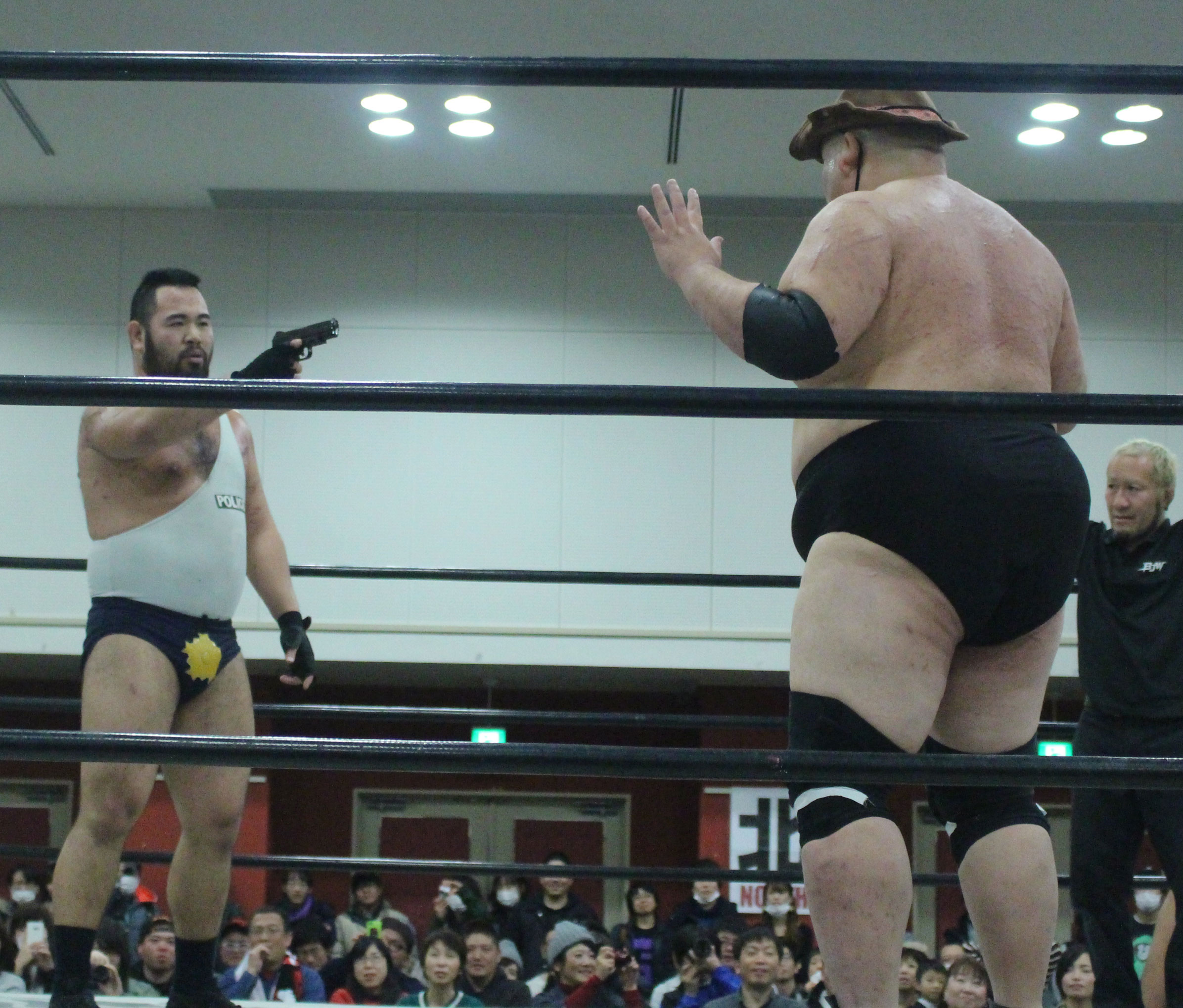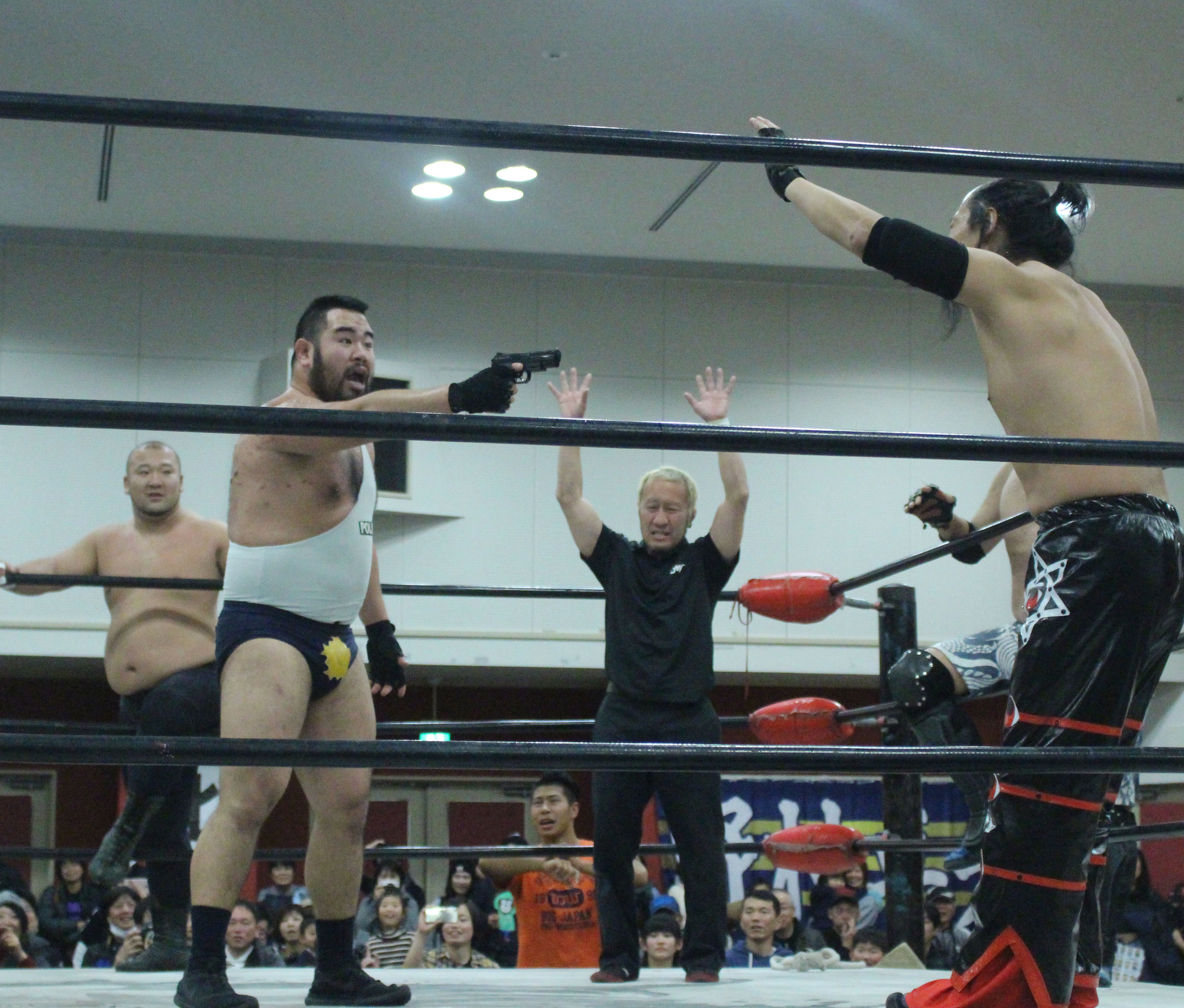 まず吉野がディーノの地獄門の餌食にされると、植木はピストルをディーノの尻に突っ込み、銃口を野村の口に突っ込もうとするが、マック竹田レフェリーが制止に入って揉み合いとなり、銃口は吉野の口に突っ込まれ、吉野は真っ白な灰となってしまう。