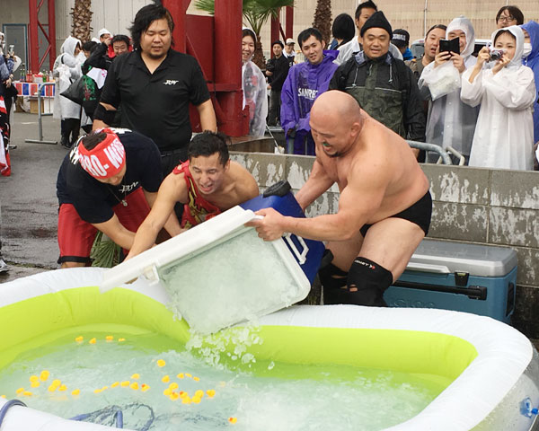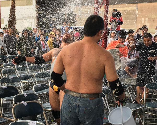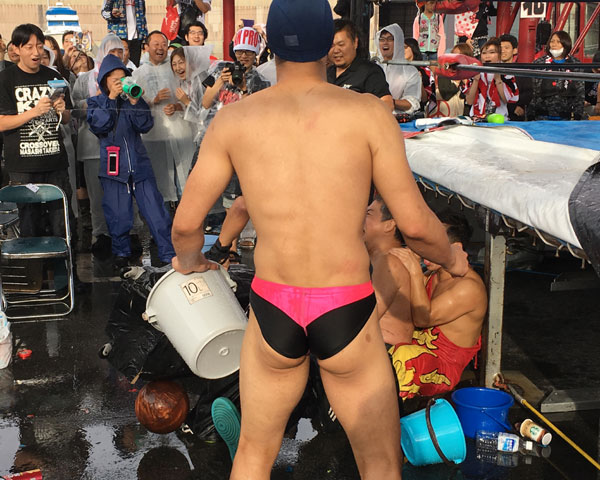 戦いは会場外へと雪崩れ込み、なぜか設置されていたビニールプールでの攻防となり、忍と岡林は観客を巻き込みながら水をかけ合いを展開、そしてクーラーボックスから大量の氷が放り込まれ、なぜか巻き込まれた星野が植木に氷入りのプールへパワーボムを狙うが、植木がリバースして星野がプールへと投げ込まれ、伊東が冷たくなったプールの水を観客にぶっかけ、自分も顔面にダイレクトに直撃、岡林もプールをひっくり返して地面中水まみれにする。