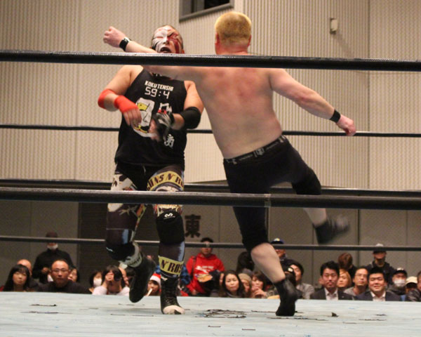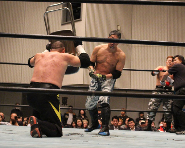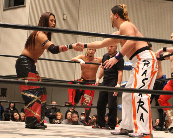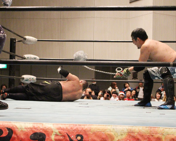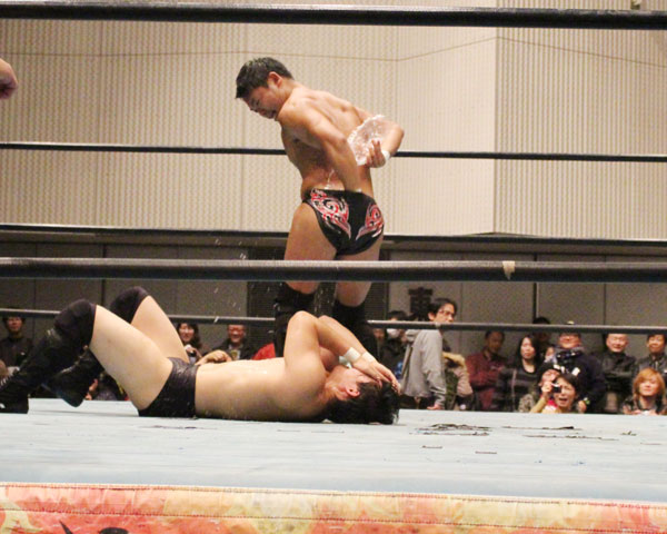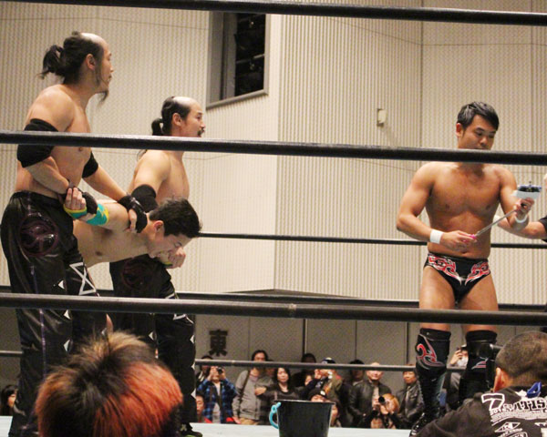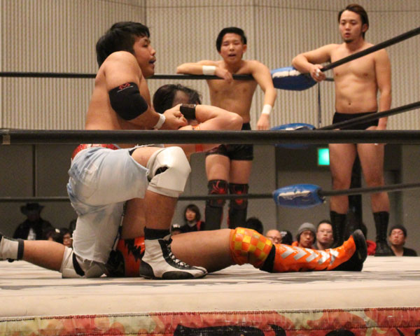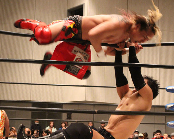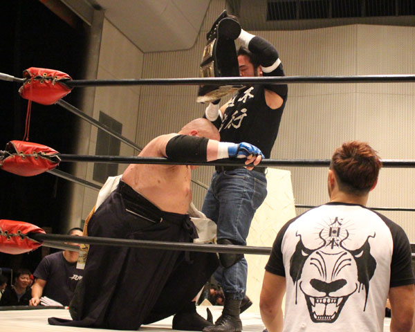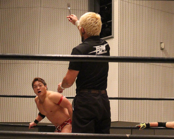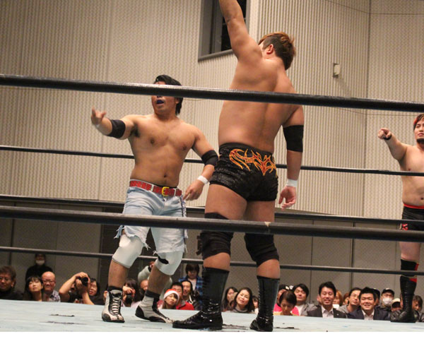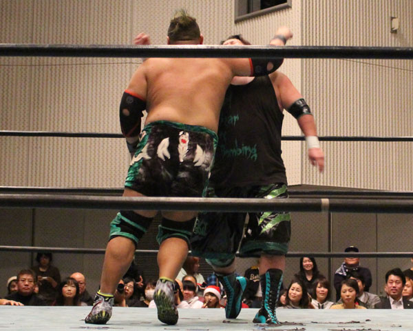 最後はイサミがパートナーである塚本にも容赦ない攻めを見せ、絶槍から勇脚を狙うも塚本がかわしたところでヨーロピアンクラッチで丸め込んで勝利。