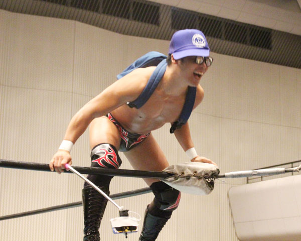 試合は例のごとくブランド品をかっさらった千賀がバラモンの水噴射をブロックして「千賀●ね!」コールが巻き起こり、野村も逆さ吊りにされて吉野から股間に水、バラモン兄弟からボウリング攻撃の洗礼を浴びてしまう。