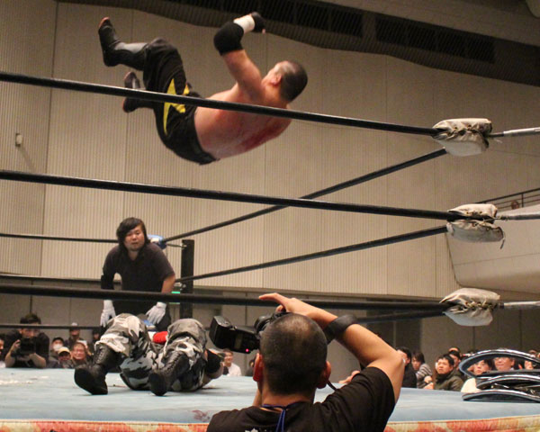 高橋も星野に反撃してハンマーを投げるが、キャッチした星野が突進し、竹田と共に攻めたて、蛍光灯束の上へのチョークスラムからダイビングセントーンで3カウントを奪い勝利を収める。