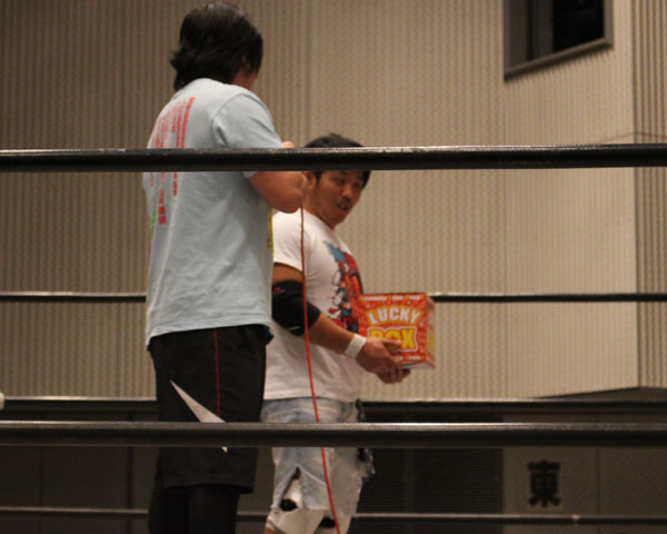 試合後は登坂代表とストロング王者の関本とデスマッチ王者のアブ小とのトークイベントが行われ、その後で丸山と佐久田司会の大抽選会が行われる。