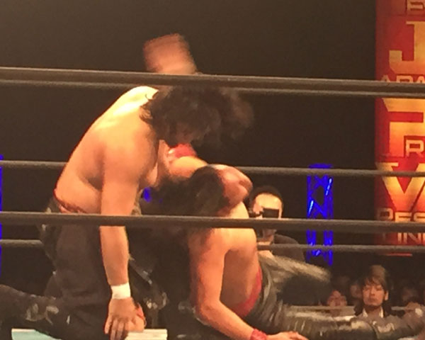 後半に飯伏とAJが再び対峙、飯伏はミサイルキック、ローリングソバット、ハイキック、カウンターミドルキック、その場飛びシューティングスタープレスとお馴染みの攻撃を見せるが、AJはフェノメノンDDTで反撃してスタイルズクラッシュを狙うが飯伏はスルー、2度目も内藤がカットする。最後は飯伏が裕二郎にラリアットを浴びせてから投げ放しラストライド、フェニックススプラッシュで3カウントだったがAJと飯伏は互いに手の内は見せず仕舞いで終わった。