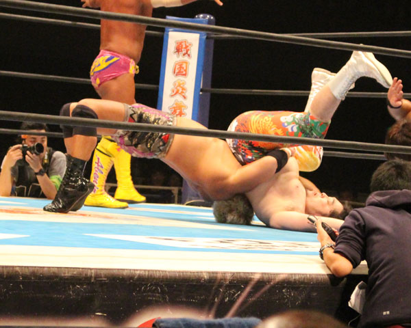 田口ワールドを嫌ったロスインゴは田口を捕らえてパラダイスロックで捕獲してから尻に低空ドロップキックを放ち、田口もEVILにヒップアタックを狙うがアトミックドロップで迎撃されてしまう。