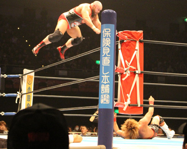そのメインの内藤vsエルガンはエルガンが持ち前のパワーを駆使して内藤の制御不能ワールドを潰しにかかり、エルガンがエプロンからトペコンヒーロを発射すれば、リングに戻った内藤はコーナーのエルガンをドロップキックで落としてからトペスイシーダを発射するも、キャッチしたエルガンは花道めがけてブレーンバスターで投げ、リングに戻ってロープ越しのファルコンアローを狙うが、阻止した内藤はロープを使っての膝攻めから執拗な膝攻めを展開、だがエルボーや逆水平、延髄斬りで応戦し変形のファルコンアローから串刺しラリアット、コーナーへのジャーマン、ジャーマンスープレックスホールド、ラリアットと攻勢をかけ、内藤はトルネードDDTで反撃を狙うが、エルガンが堪えてブレーンバスターで投げようとするが、内藤はエルガンのパワーを逆用してDDTで突き刺す。