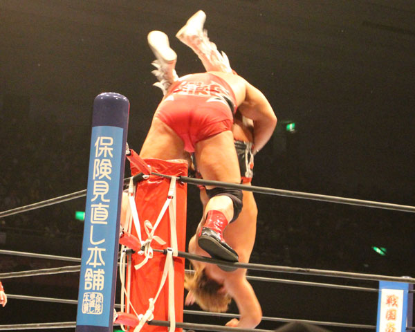 両者はエプロンの攻防となると、唾を吐く内藤に対してエルガンはエプロンでのデスバレーボムを敢行、更にロープ越しでのぶっこ抜きファルコンアローから後頭部、正面へとローリングエルボーを打ち込みエルガンボムを狙う。しかし逃れた内藤はトルネードDDTで突き刺してからデスティーノと畳み掛けるが、エルガンはカウント2でキックアウトする。