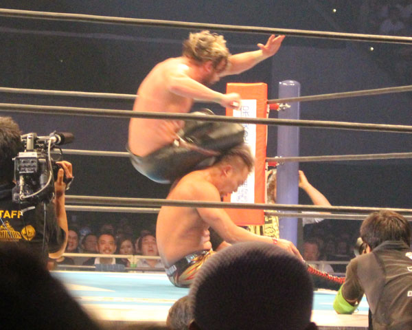 それでも勢いの止まらないオカダはドロップキックを狙うが、タイミングを外したケニーがスパインボムで叩きつけ、オカダのフロントハイに対して逆水平、ドラゴンスープレックスで返したケニーは突進するも、キャッチしたオカダはケニーをコーナーに据えて下からのドロップキックを発射、リング下のテーブルにケニーを乗せたオカダはコーナーからのダイビングエルボードロップを投下、テーブルは割れたものの貫通せず、ケニーもよけ損ねたためオカダも大ダメージを負ってしまう。