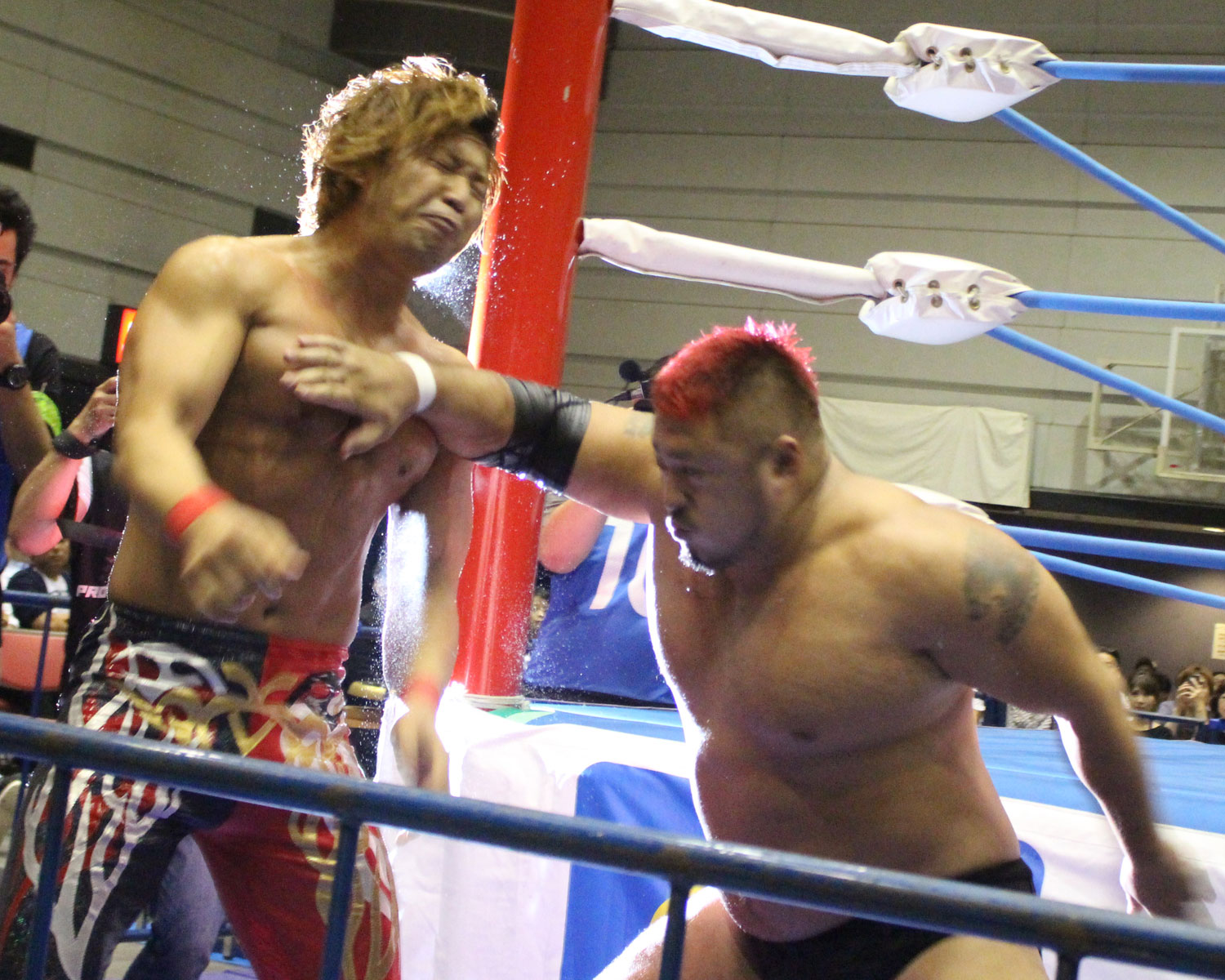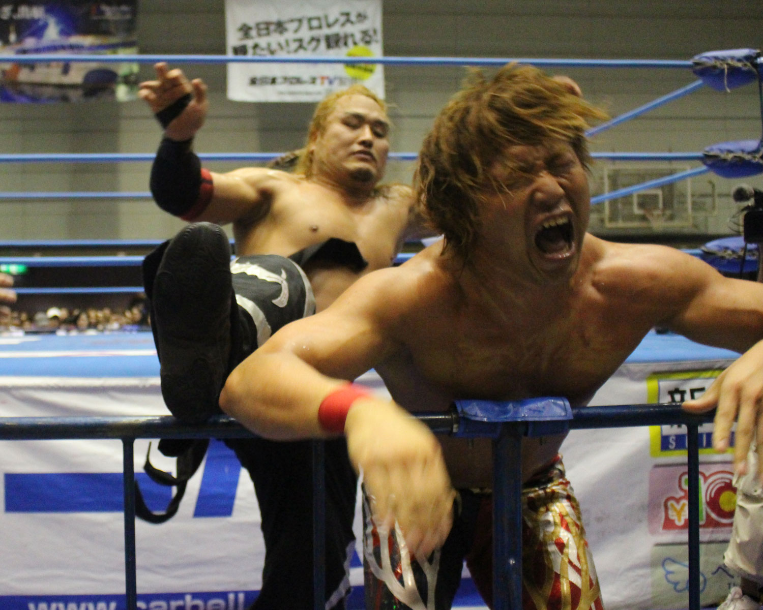 これで流れを戻した岩本はリングに戻ってネックブリーカー、トップロープに近藤を固定してネックスクリュー、ニーアッパーで近藤がダウン、岩本がラリアット狙うが、近藤がカマイタチで迎撃も、岩本は後頭部ラリアットからジャーマンで投げれガ、近藤もジャーマンで投げ返し、ジャーマン合戦から岩本が突進も、近藤はキングコングラリアットもダメージでカバーできない。