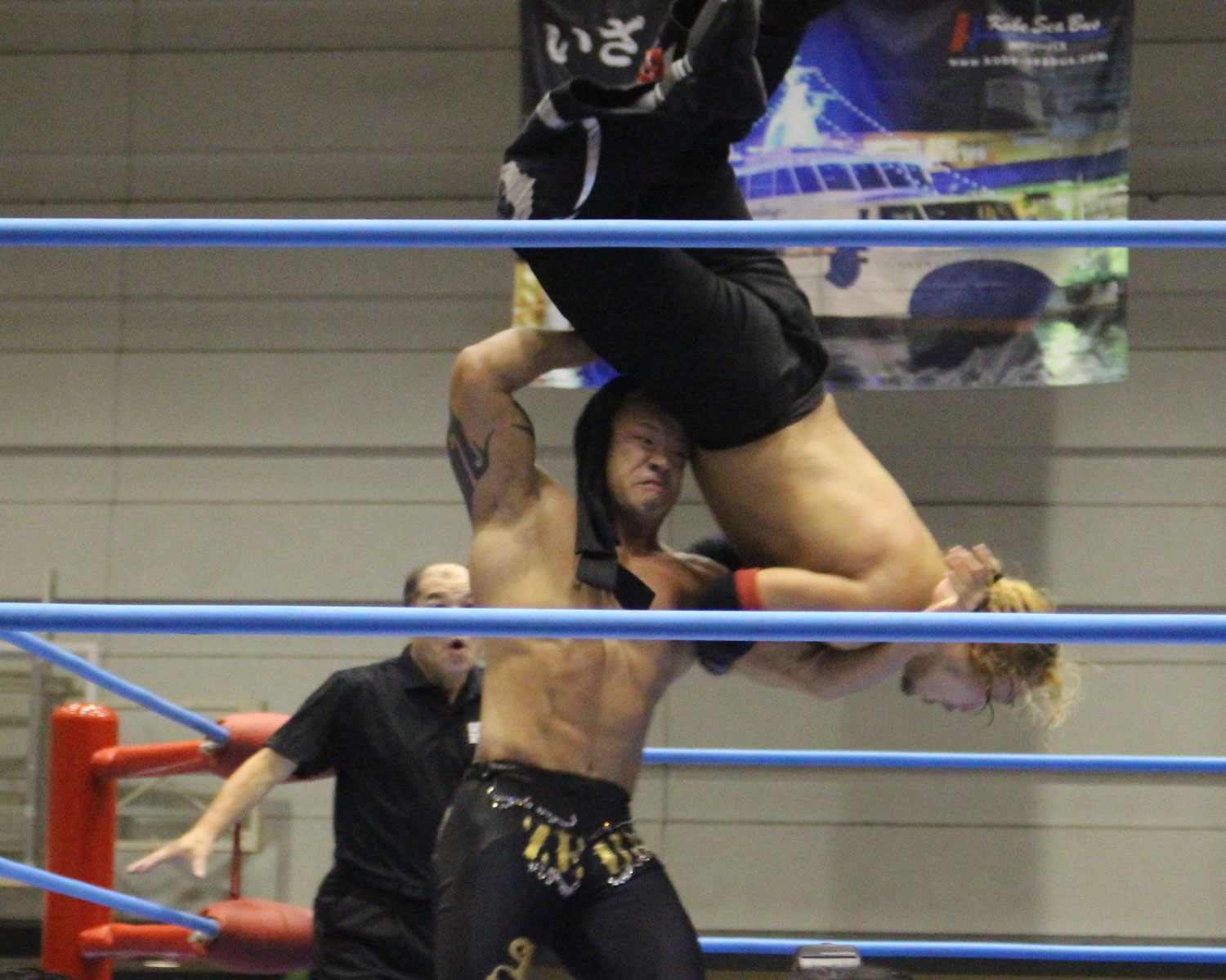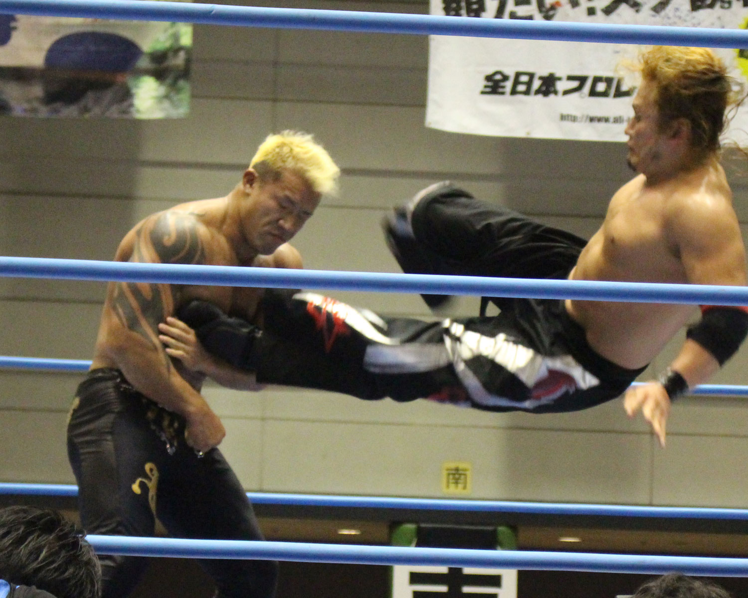 石川はジャイアントニーを狙うが、真霜がキャッチしてエルボー合戦に持ち込み、キチンシンクの応酬も、真霜がジャーマン、石川が突進したところでジャンピングハイキックを炸裂させる。