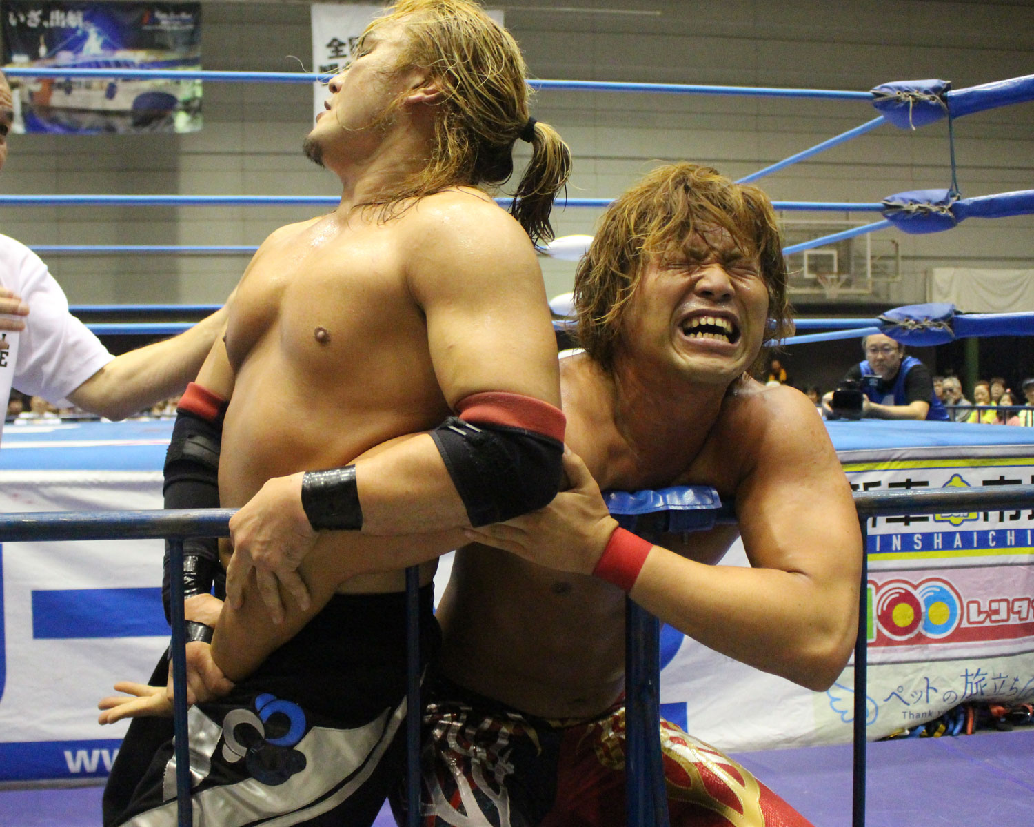 しかし秋山の表情が変わると頭突きの連打で逆襲し、倒れこんだジェイクの顔面に何度もニーを投下、起き上がったところでランニングニーを連発、エプロンにジェイクをセットしてギロチンニーを投下、キラー秋山が降臨して怒涛の攻めで一気にリードを奪う。