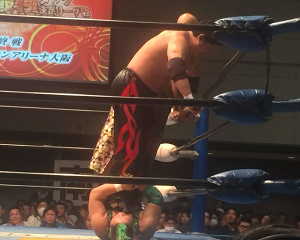 ビッグガンズはやっとゼウスに交代し諏訪魔が早くもラストライドを狙うが、ゼウスがリバースするとラリアットからフライングラリアットと猛攻をかけ、劣勢となった諏訪魔もやっと宮原にタッチして交代し、宮原も勢いに任せて押しまくる。