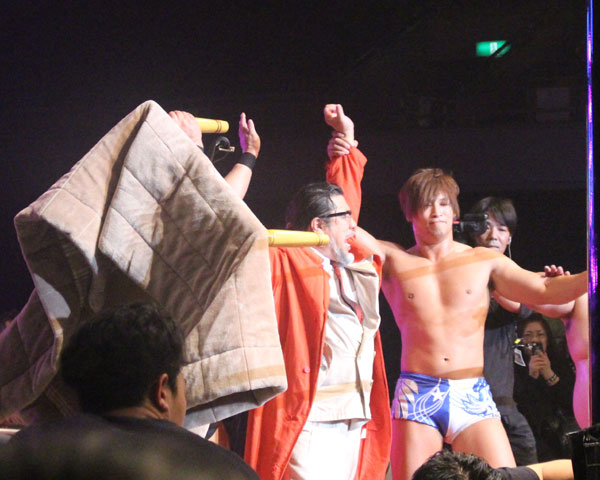 俵太さんからこたつを伝授された高木はテーブルに寝ていた貴にこたつを背負った高木がダイビングボディープレスも、かわされてしまい自分だけがテーブルに貫通してしまい、貴は飯伏にイスのオプジェへのスーパーパワーボムを狙うが、飯伏は雪崩式フランケンシュタイナーで切り返して貴がイスへと直撃してしまう。