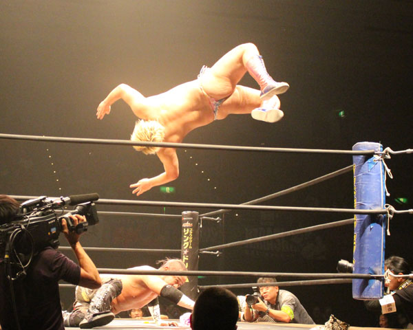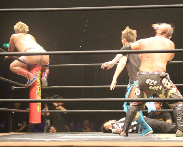しかしディーノが追いかけて葛西を花道へと戻すと男色殺法でグロッキー状態?へと追い込んでから、テーブル貫通男色ドライバーで突き刺し、葛西に大ダメージを与える。
