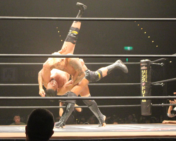 HARASHIMAvsKENSOは張り手で先手を奪うKENSOに対し、HARASHIMAは左肩へのギロチンドロップから腕攻めを展開する、KENSOは腰紐攻撃で反撃すると、場外へ追いやった後でプランチャを発射、更に場外マットを剥いでからDDTで突き刺す。