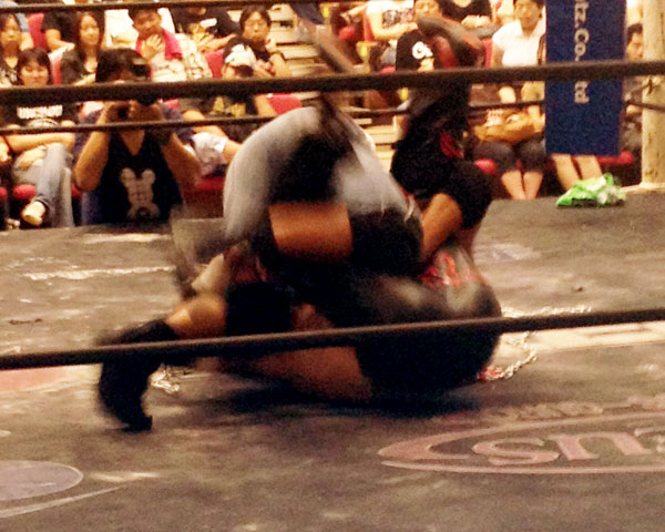 しかし先手を奪ったのは竹田、アンクルホールドで葛西の痛めている膝を攻め、葛西はハーリー・レイス式ダイビングヘッドバットで反撃も、勝負を焦ったのかリバースタイガードライバー狙いは不発となる。