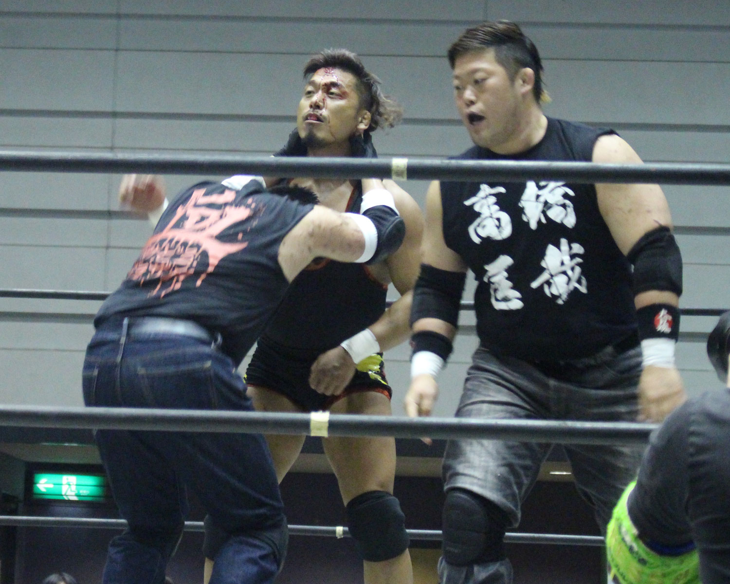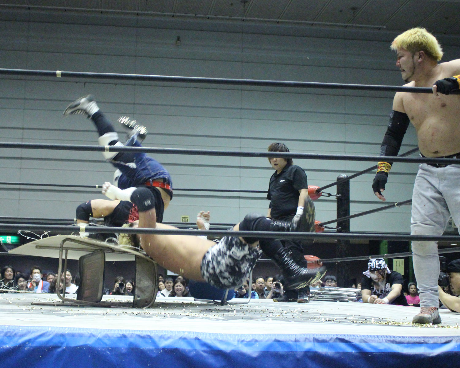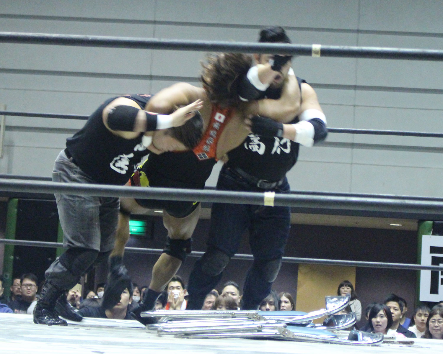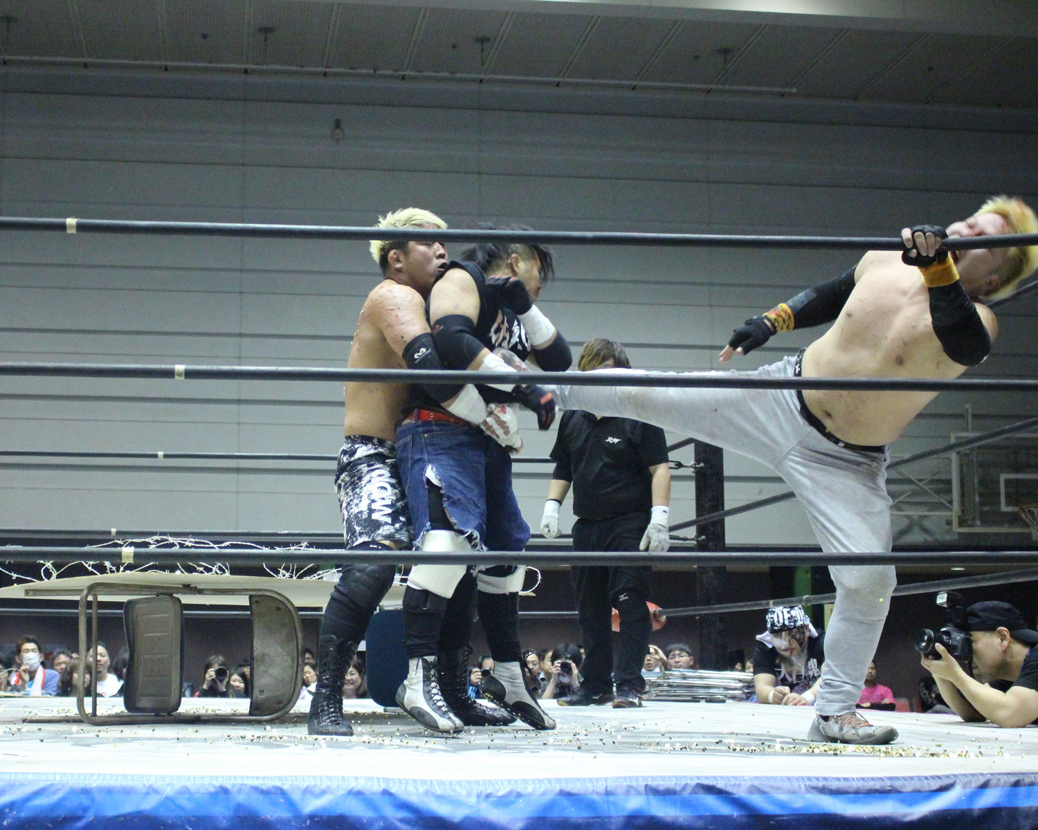傷口もえぐられるなどして苦戦を強いられた鷹木は血みどろの二人をまとめてイス盛りの上へのコンプリートショットで反撃し、交代を受けた宮本も高橋にイスを何脚も投げつけてからハンドスプリングエルボーで盛り返し、息を吹き返した鷹木もグーパンチ&逆水平の天龍コンポを浴びせて、次第に流れを変えていく。