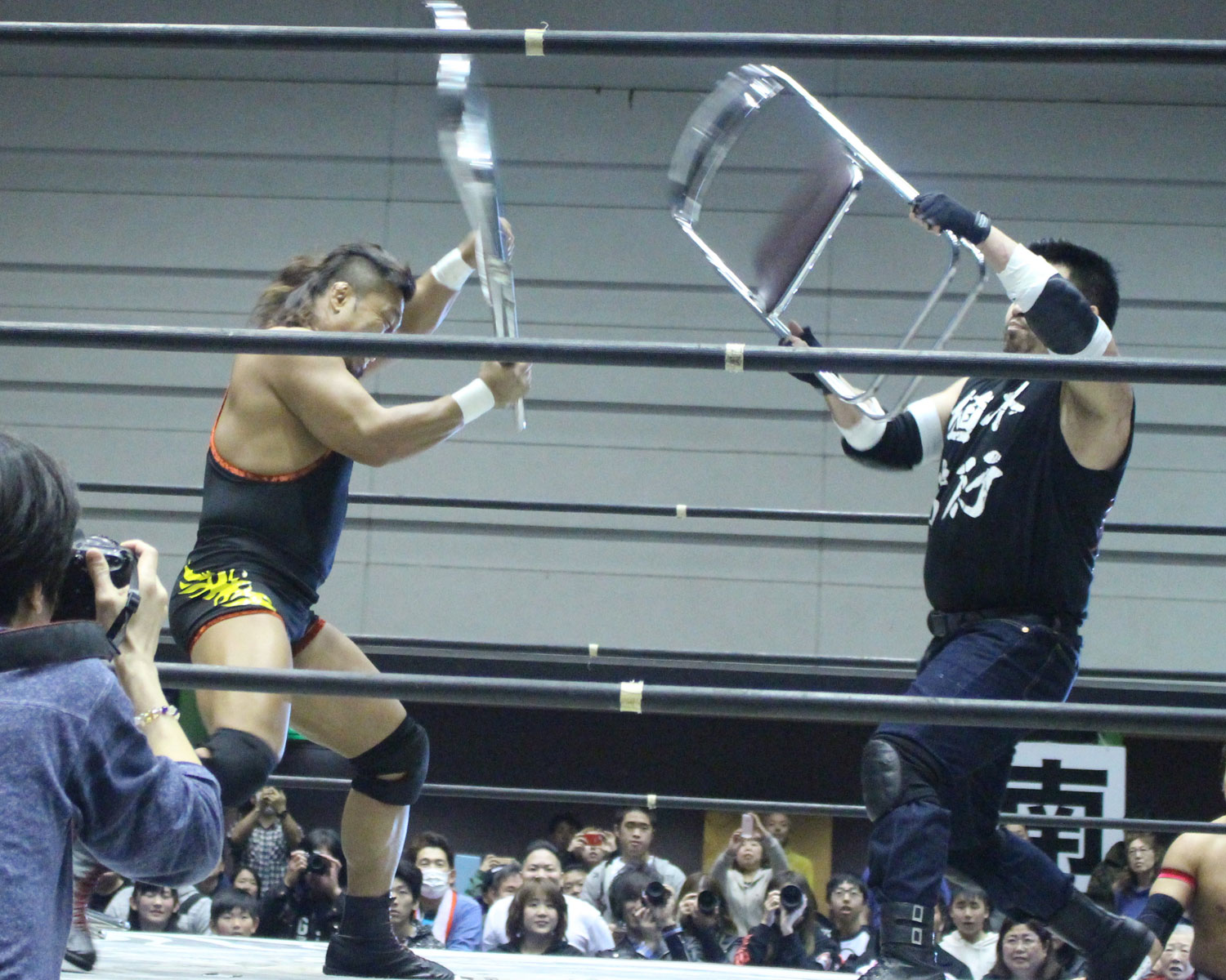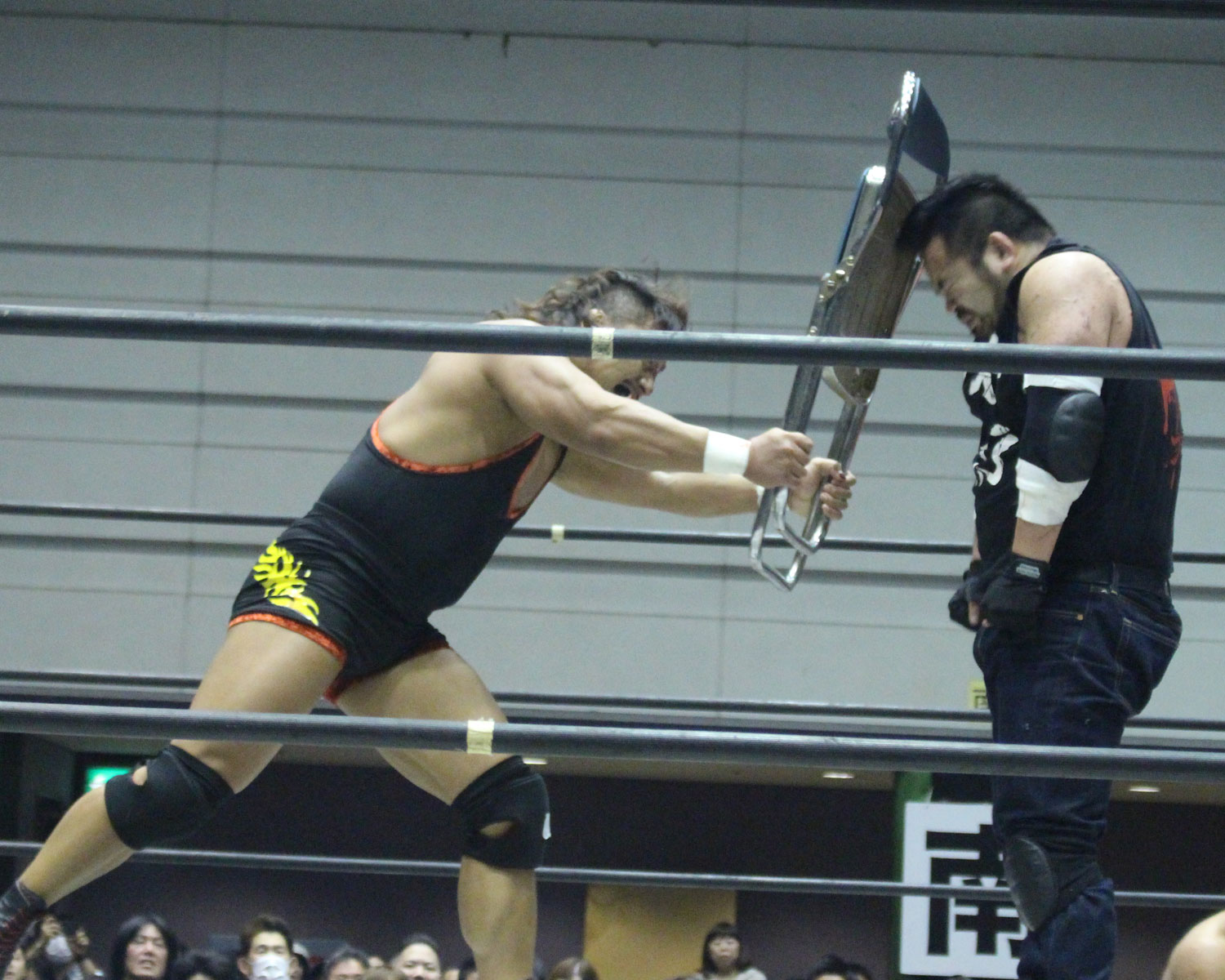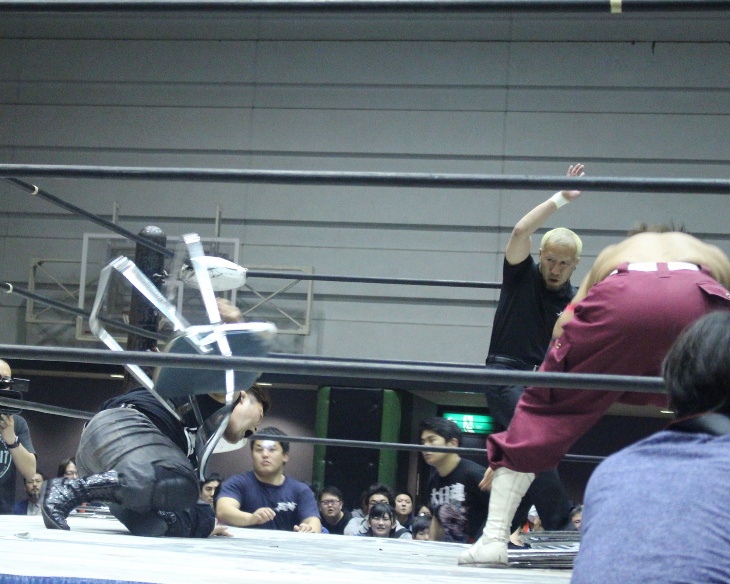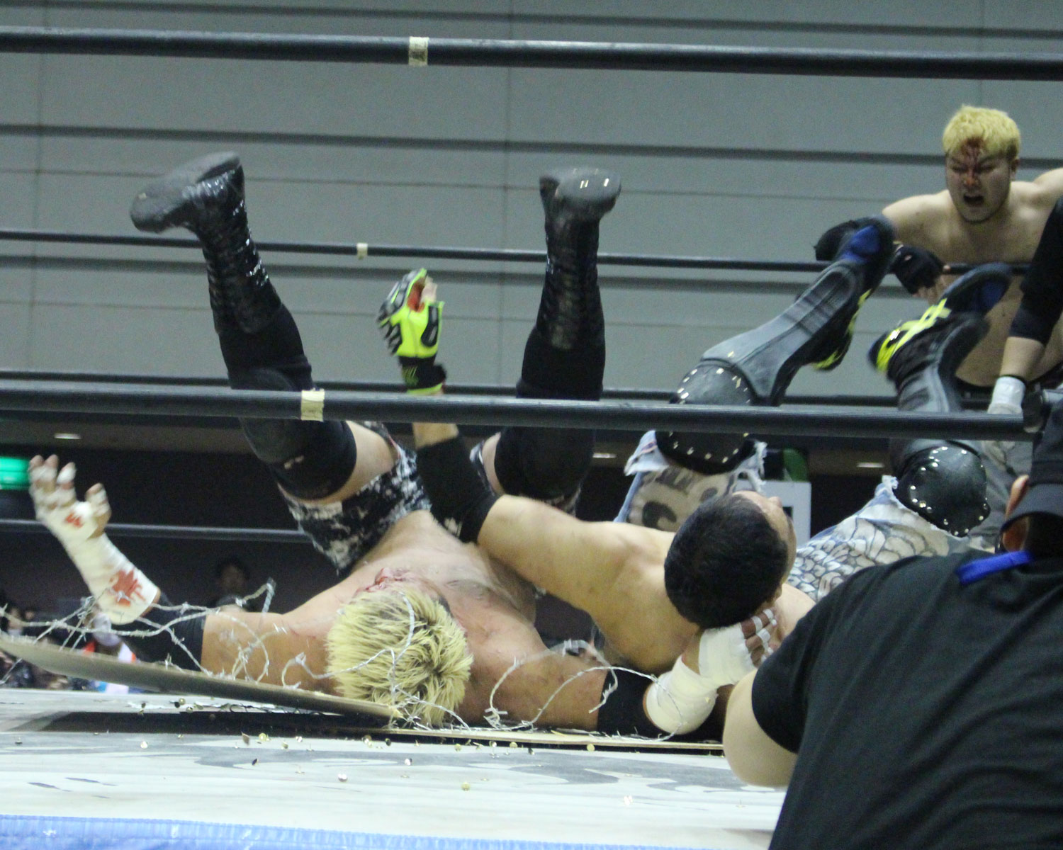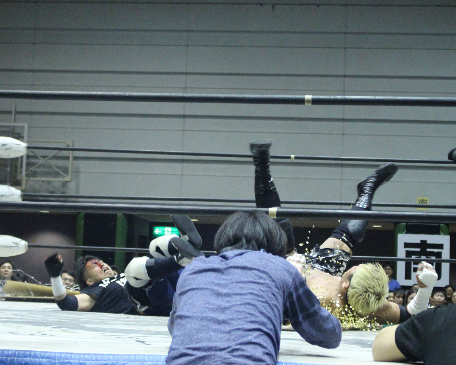 傷口もえぐられるなどして苦戦を強いられた鷹木は血みどろの二人をまとめてイス盛りの上へのコンプリートショットで反撃し、交代を受けた宮本も高橋にイスを何脚も投げつけてからハンドスプリングエルボーで盛り返し、息を吹き返した鷹木もグーパンチ&逆水平の天龍コンポを浴びせて、次第に流れを変えていく。
