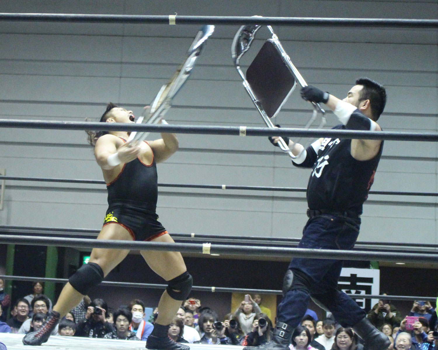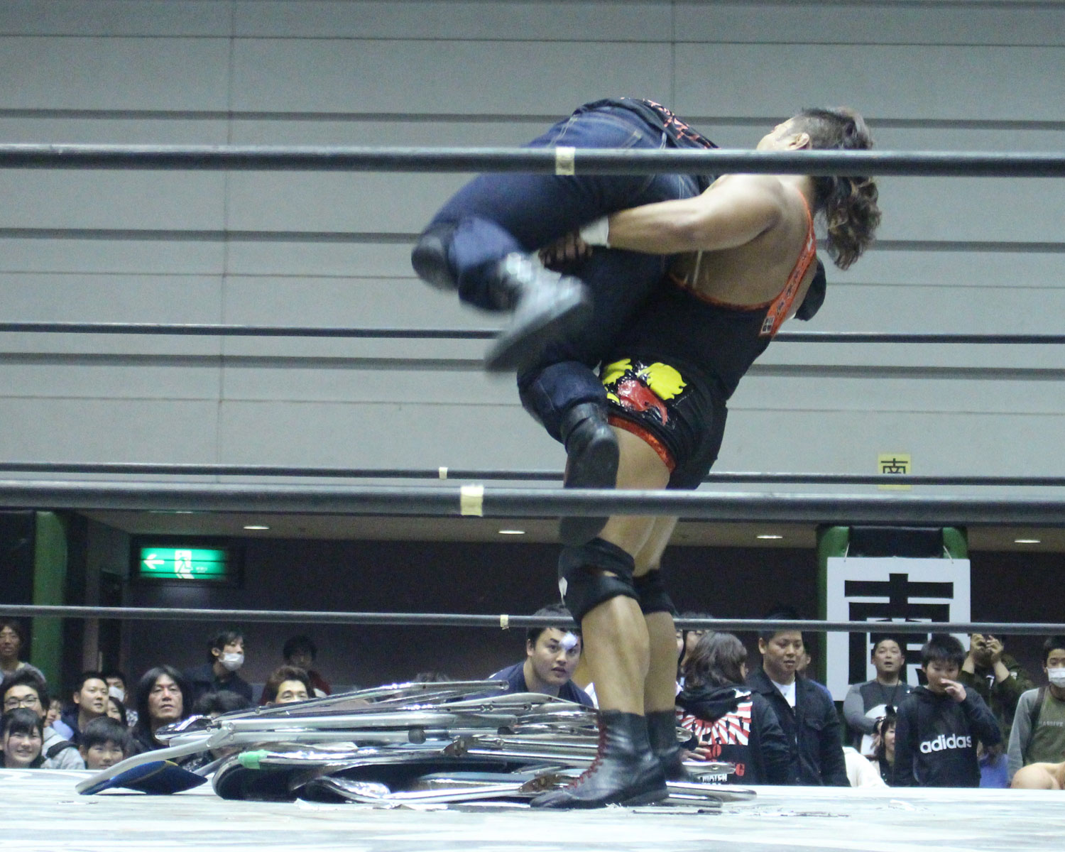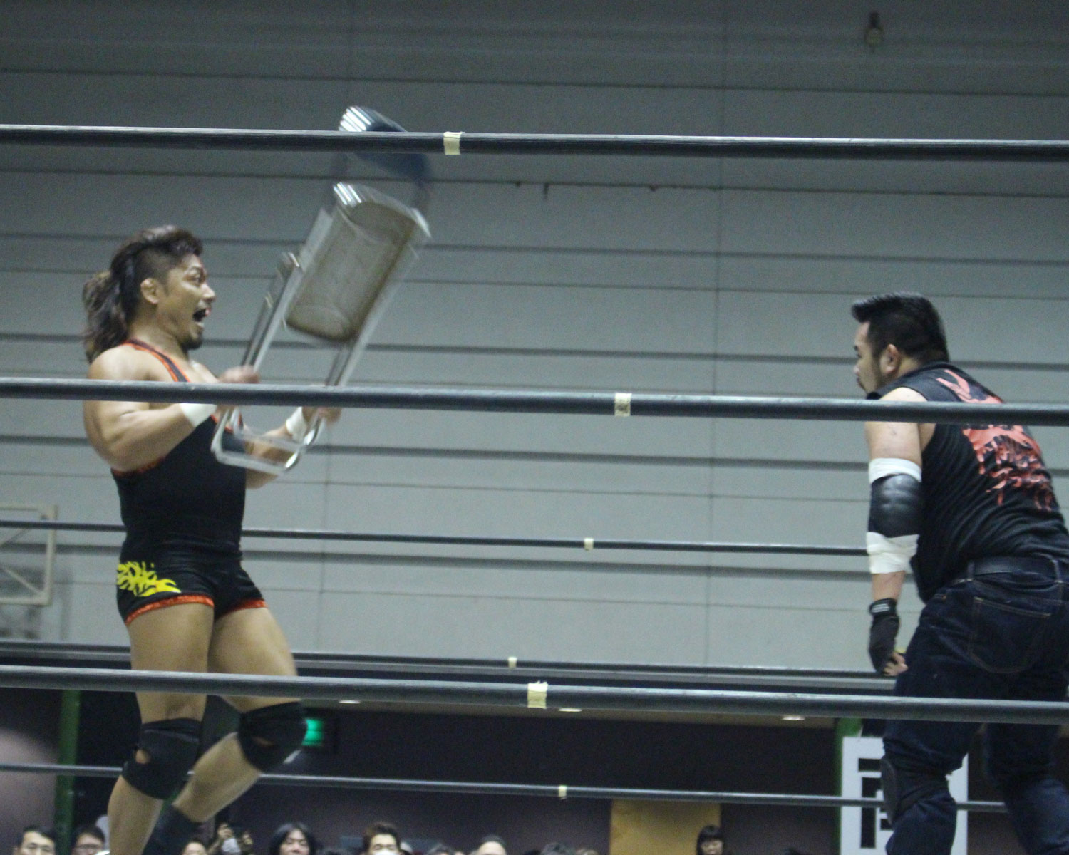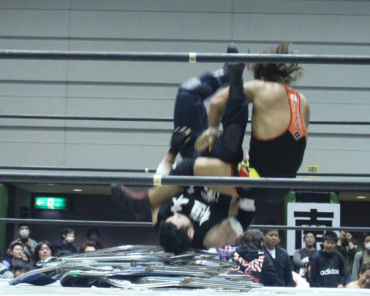 傷口もえぐられるなどして苦戦を強いられた鷹木は血みどろの二人をまとめてイス盛りの上へのコンプリートショットで反撃し、交代を受けた宮本も高橋にイスを何脚も投げつけてからハンドスプリングエルボーで盛り返し、息を吹き返した鷹木もグーパンチ&逆水平の天龍コンポを浴びせて、次第に流れを変えていく。