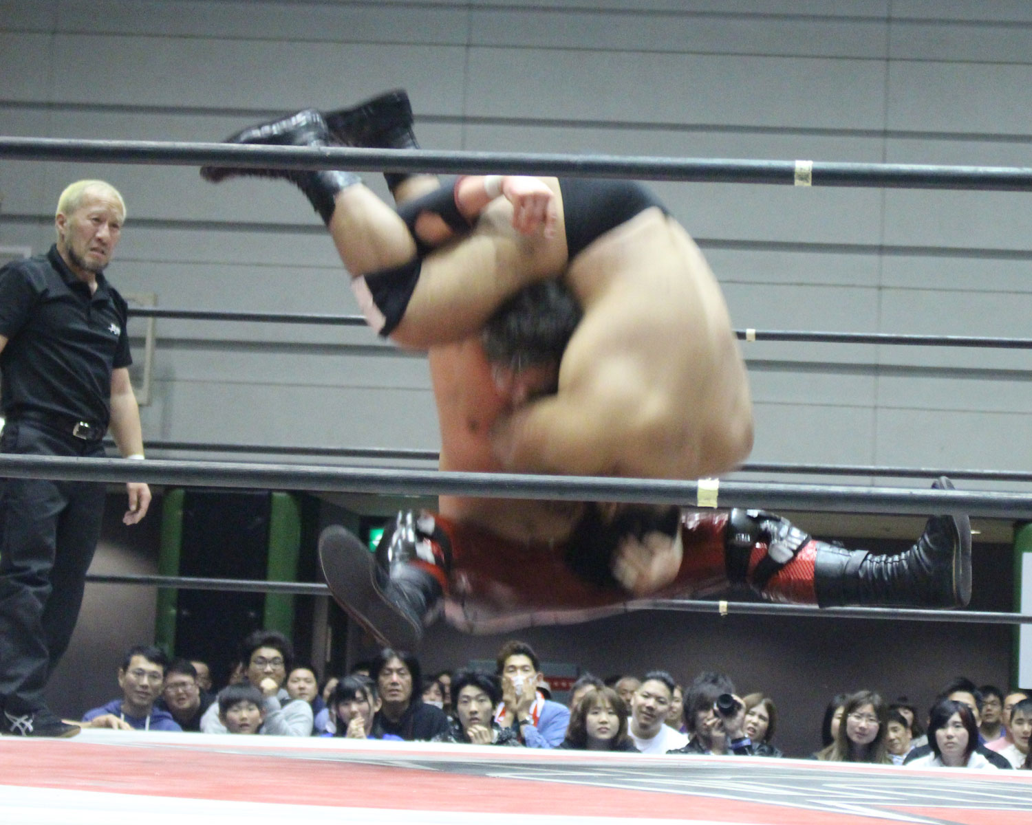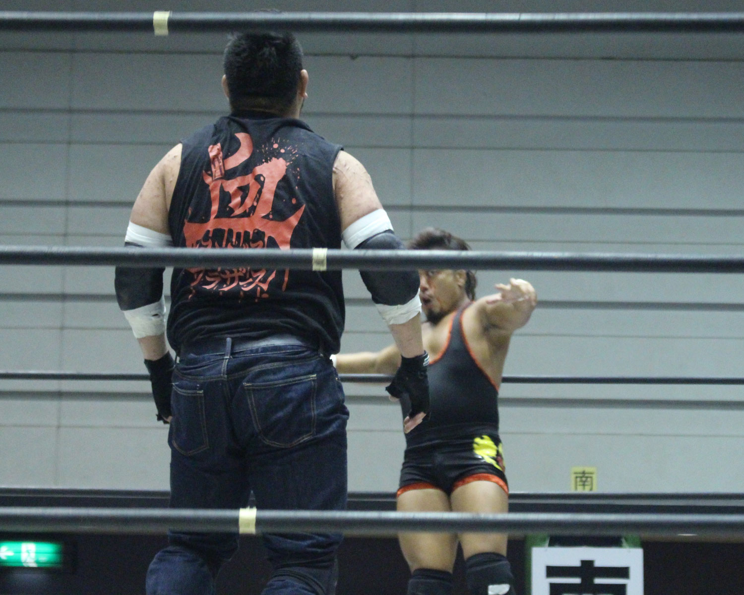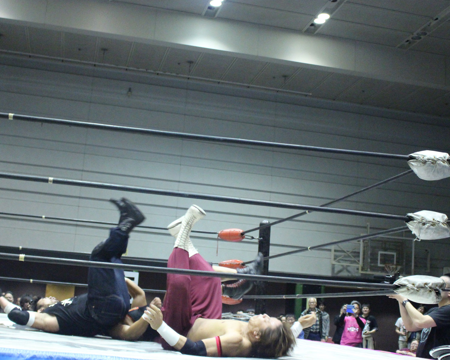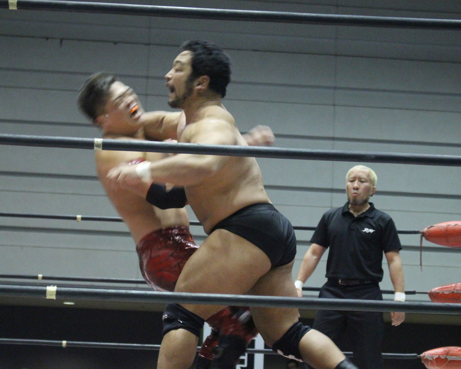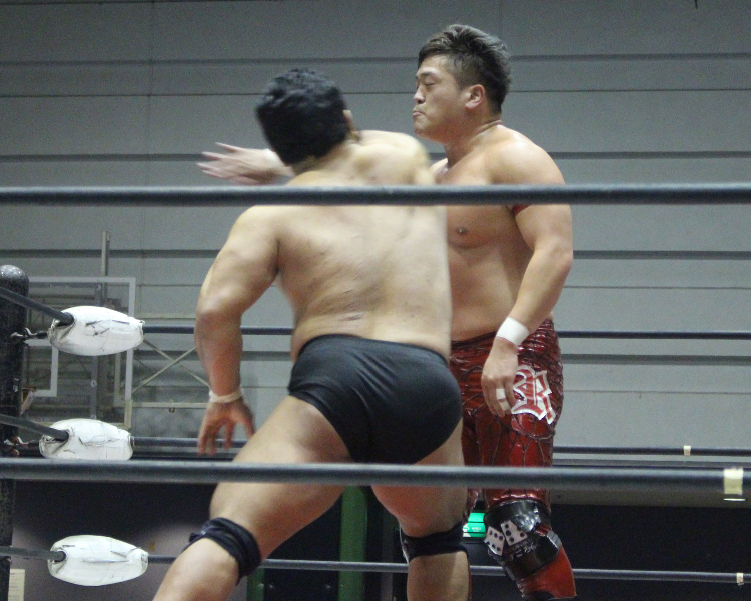 しかし河上のエルボーに対して、関本はラリアットで応戦すると、ボディースラムを連発してから逆エビ固めで捕獲、逆水平合戦も関本のサイドスープレックス狙いを河上がリバース、天龍コンポからのエクスプロイダー、羽折り固めと関本を絞めあげるも、関本はシュミット流バックブリーカーを決めると、フィニッシュとして使っているWXロックで捕獲して河上を追い詰める。