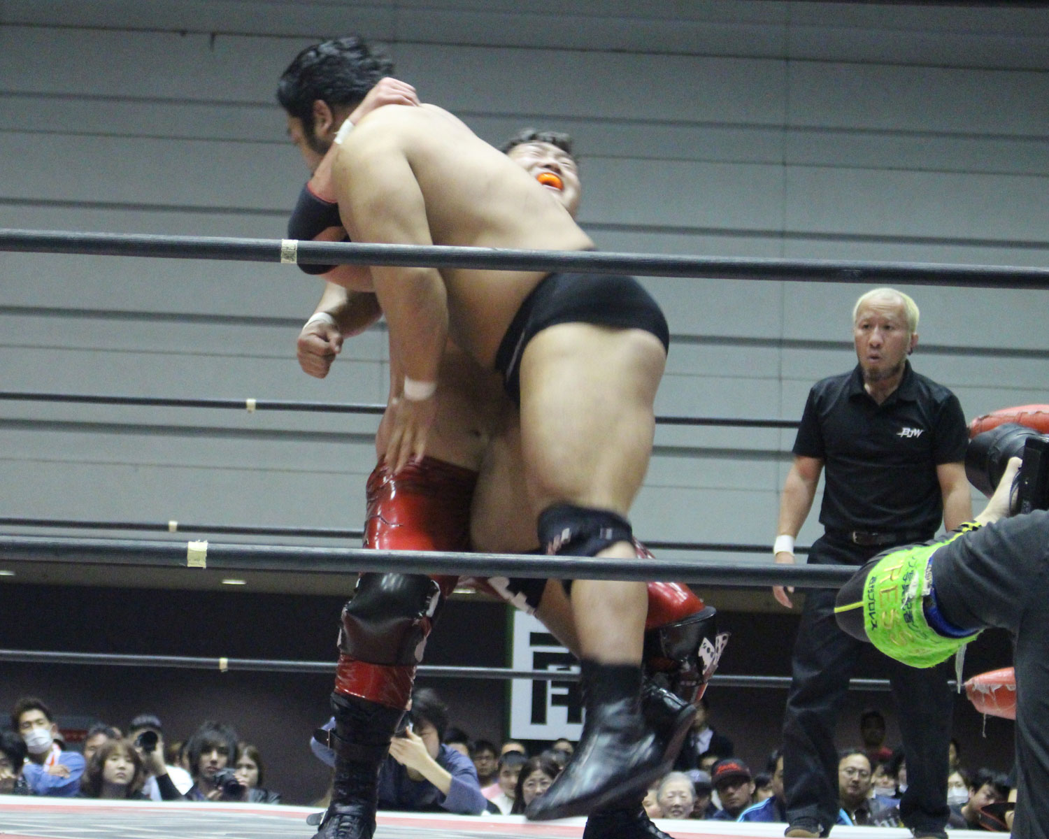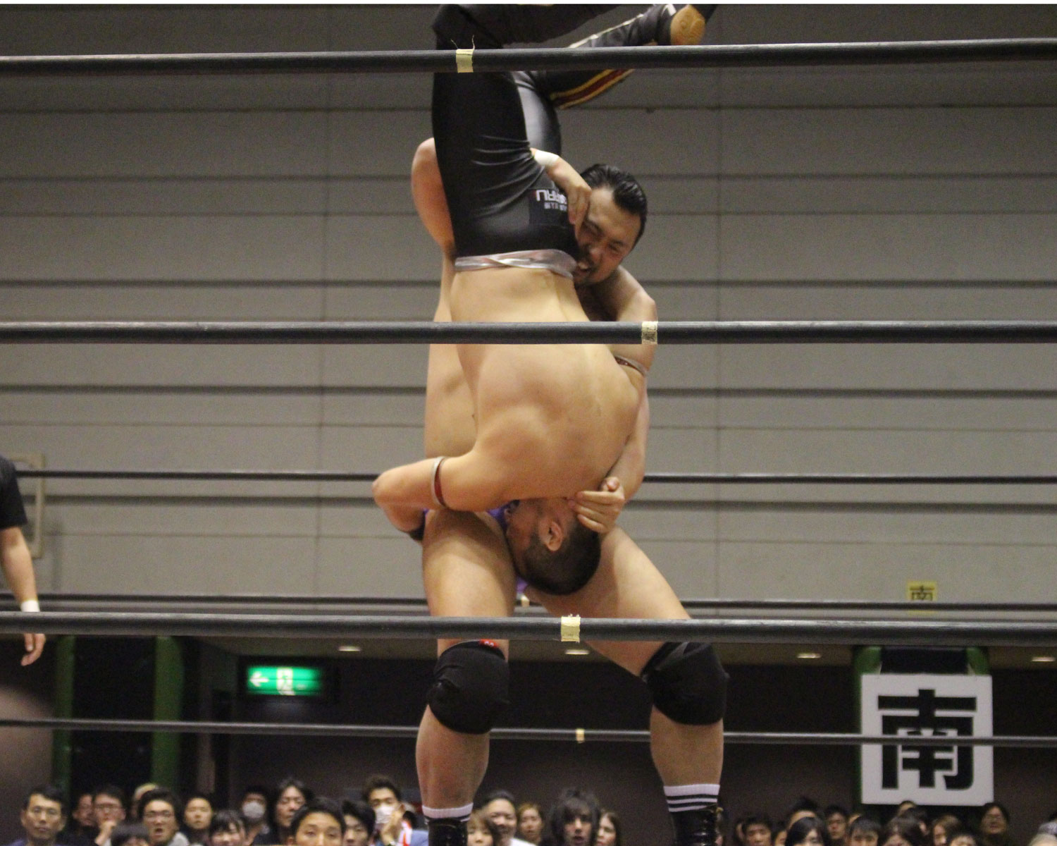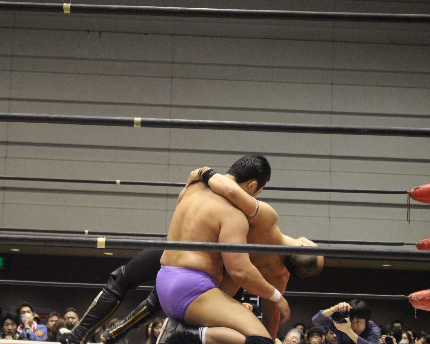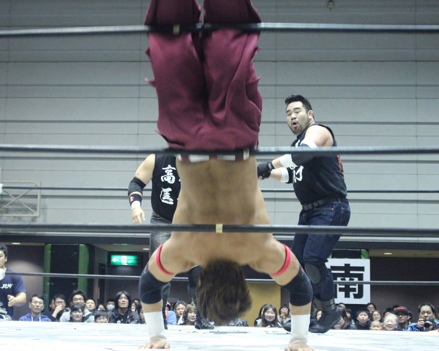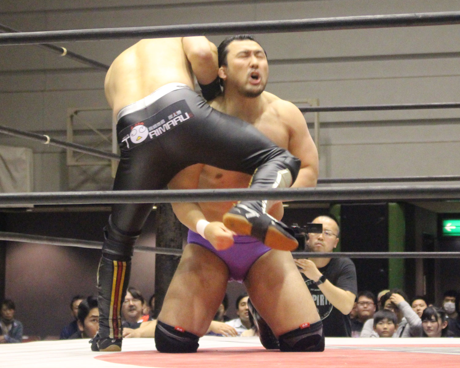 しかし河上のエルボーに対して、関本はラリアットで応戦すると、ボディースラムを連発してから逆エビ固めで捕獲、逆水平合戦も関本のサイドスープレックス狙いを河上がリバース、天龍コンポからのエクスプロイダー、羽折り固めと関本を絞めあげるも、関本はシュミット流バックブリーカーを決めると、フィニッシュとして使っているWXロックで捕獲して河上を追い詰める。